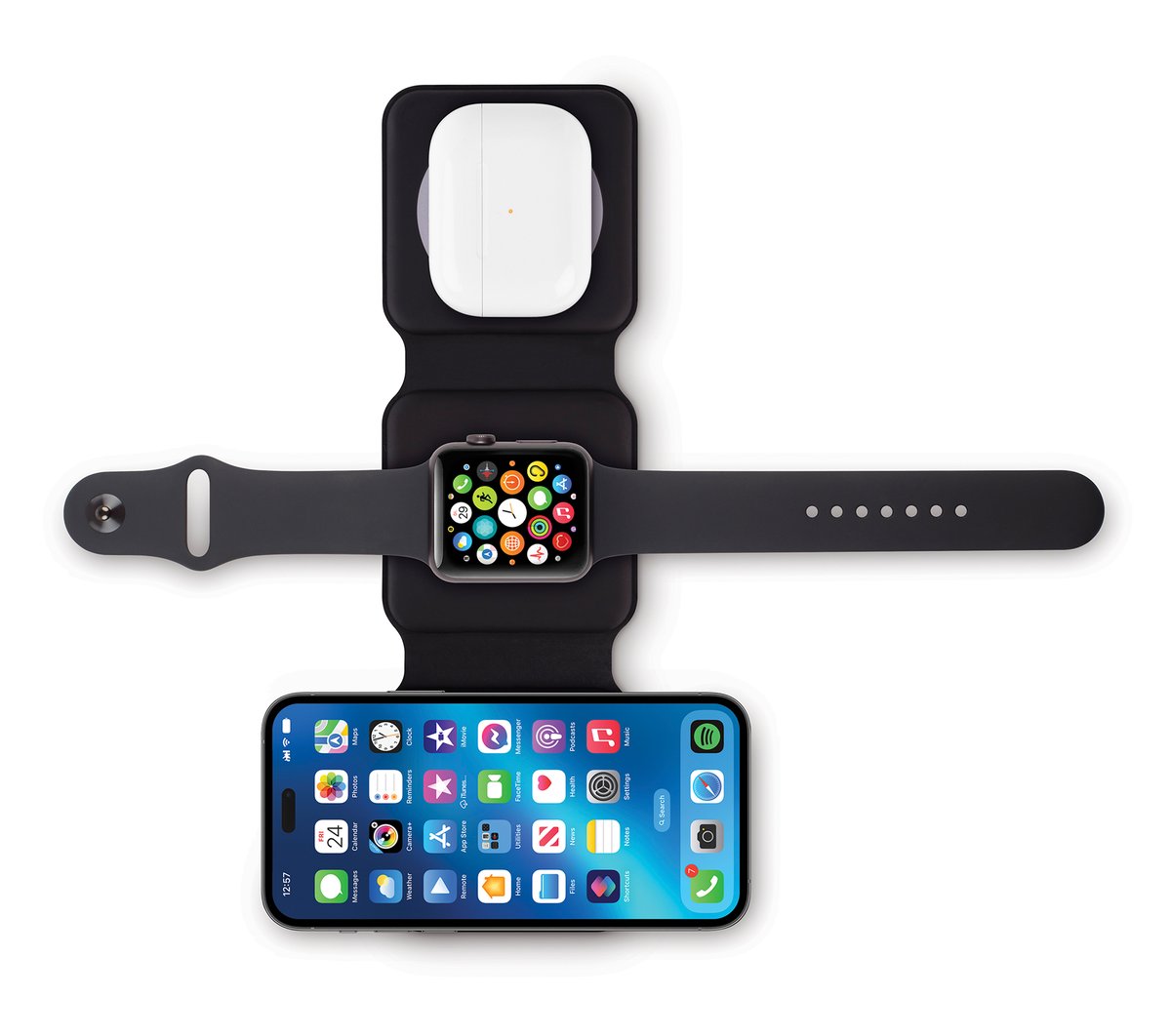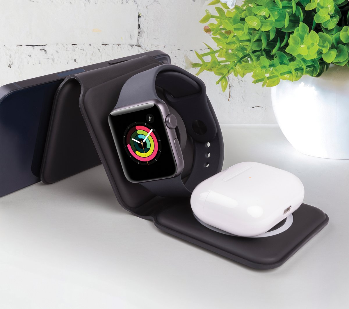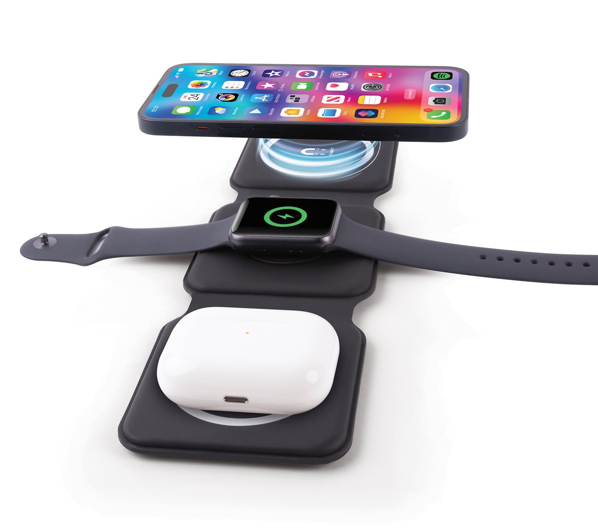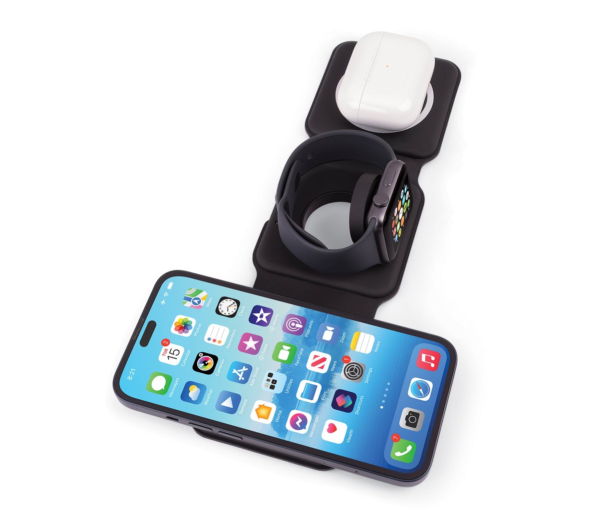 Power up your devices anywhere, anytime with Skechers 3-In-1 Foldable Wireless Charger. This ultra-convenient travel charger features a designated three-panel design to wirelessly charge a MagSafe-compatible iPhone, AirPods, and Apple Watch simultaneously. Offers up to 15W of fast-charging power for iPhone.