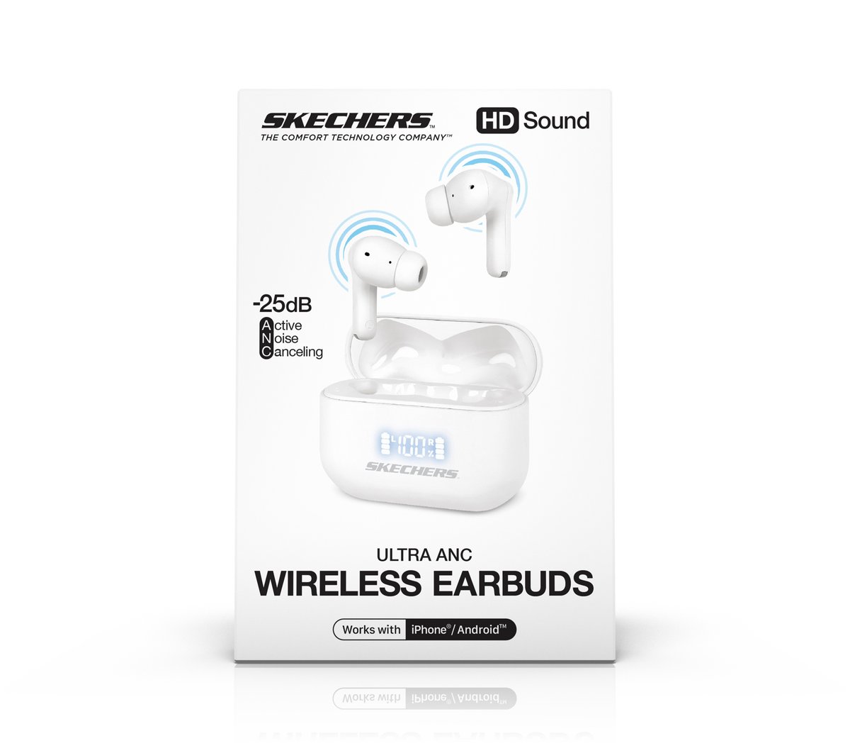 Experience clear sound with no-strings-attached comfort wearing Skechers Wireless Earbuds. This high-definition Bluetooth set features active noise-canceling technology to help keep unwanted noises out and comfort eartips in multiple sizes for your perfect fit. Includes a pocket-sized charging case with a digital battery display.