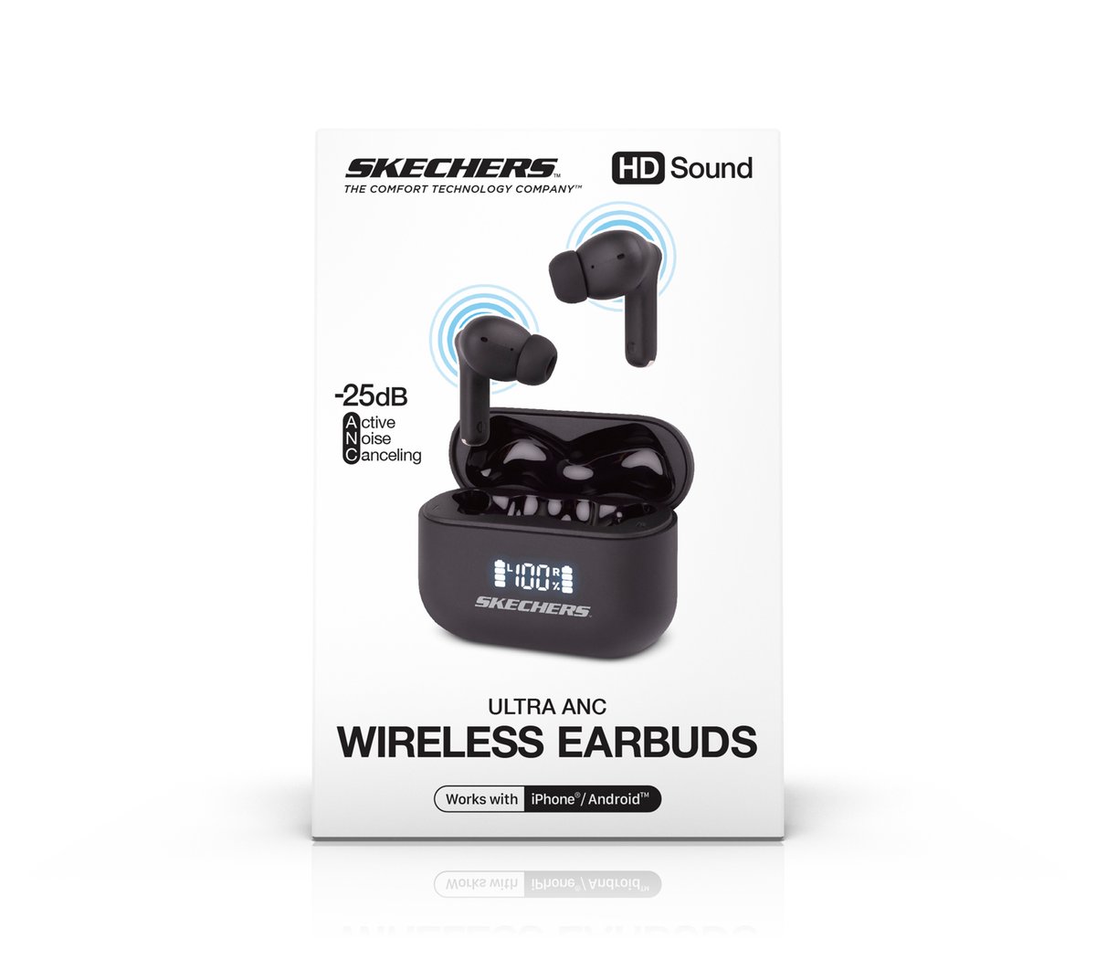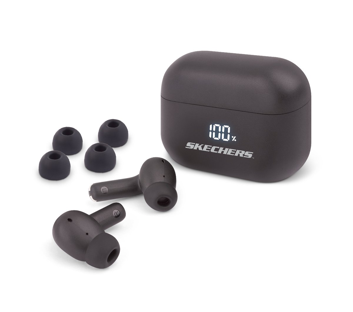 Experience clear sound with no-strings-attached comfort wearing Skechers Wireless Earbuds. This high-definition Bluetooth set features active noise-canceling technology to help keep unwanted noises out and comfort eartips in multiple sizes for your perfect fit. Includes a pocket-sized charging case with a digital battery display.