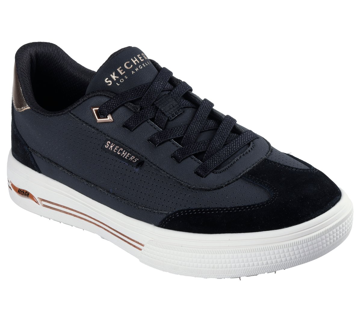 Step out in standout style and cutting-edge comfort with Skechers Street™ Arch Fit® Arcade – Diamond Daze. This easy-on design has been granted the APMA Seal of Acceptance and features a perforated duraleather and genuine suede overlay upper, fixed stretch laces, and a removable Arch Fit® insole for long-lasting support.