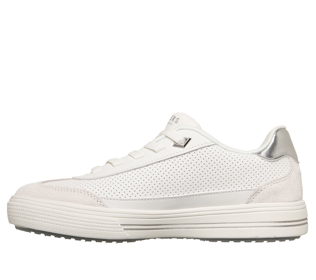 Step out in standout style and cutting-edge comfort with Skechers Street™ Arch Fit® Arcade – Diamond Daze. This easy-on design has been granted the APMA Seal of Acceptance and features a perforated duraleather and genuine suede overlay upper, fixed stretch laces, and a removable Arch Fit® insole for long-lasting support.