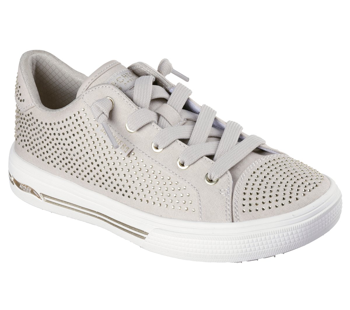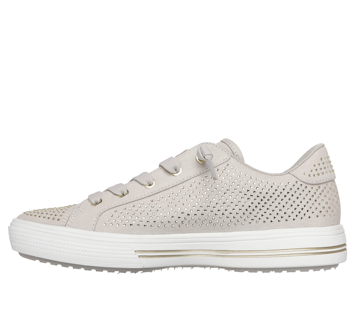 Let your unique style shine in comfort with Skechers Street™ Arch Fit® Arcade – Gem Steps. This vegan style has been granted the APMA Seal of Acceptance and features a rhinestone-embellished canvas upper with tied-off stretch laces, a supportive Arch Fit® insole, and a lightweight cushioned midsole.