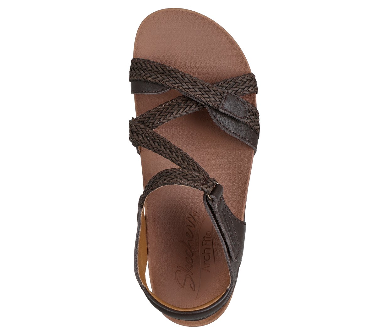 Unwind in stylish warm-weather comfort wearing Skechers Arch Fit® Granola Slim – True Vibe. This strappy slingback sandal has been granted the APMA Seal of Acceptance and features a woven leather upper with two adjustable hook-and-loop closures and a supportive Arch Fit® footbed with Luxe Foam® cushioning.