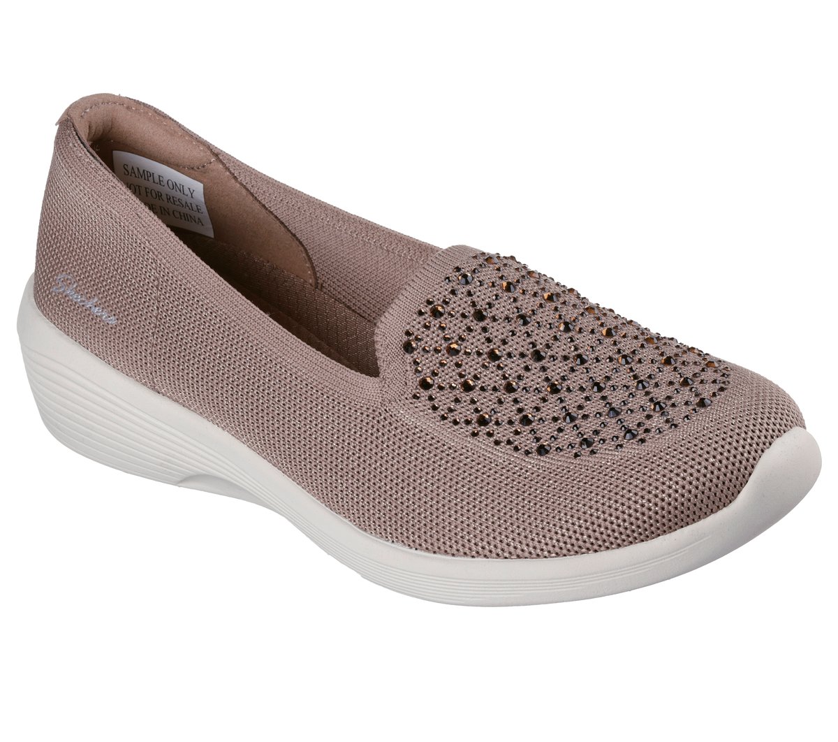 Experience casual all-day comfort in Skechers Arya – Moonlit Ray. This vegan Stretch Fit® loafer features a sparkle knit upper with rhinestone embellishments and a cushioned Skechers Air-Cooled Memory Foam® comfort insole.