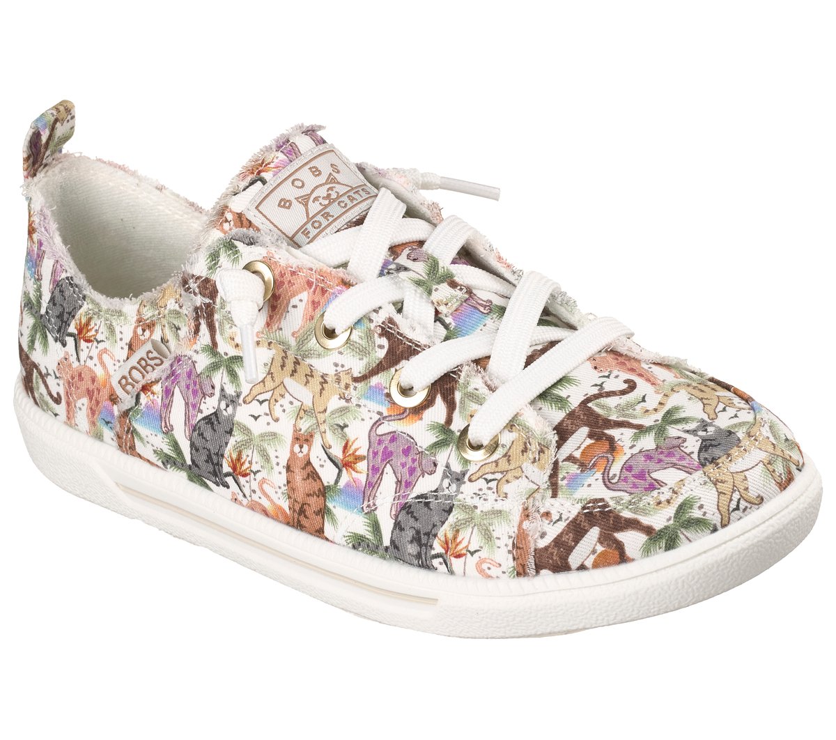 Easy-wearing comfort and classic style combine in BOBS® from Skechers® B Cute 2.0 – Jungle Steps. This casual vegan design features a ‘Vacay Day Kitty’ print canvas upper with frayed edges, tied-off laces, and a cushioned Skechers Memory Foam™ insole. BOBS® from Skechers® is committed to saving the lives of pets in need.