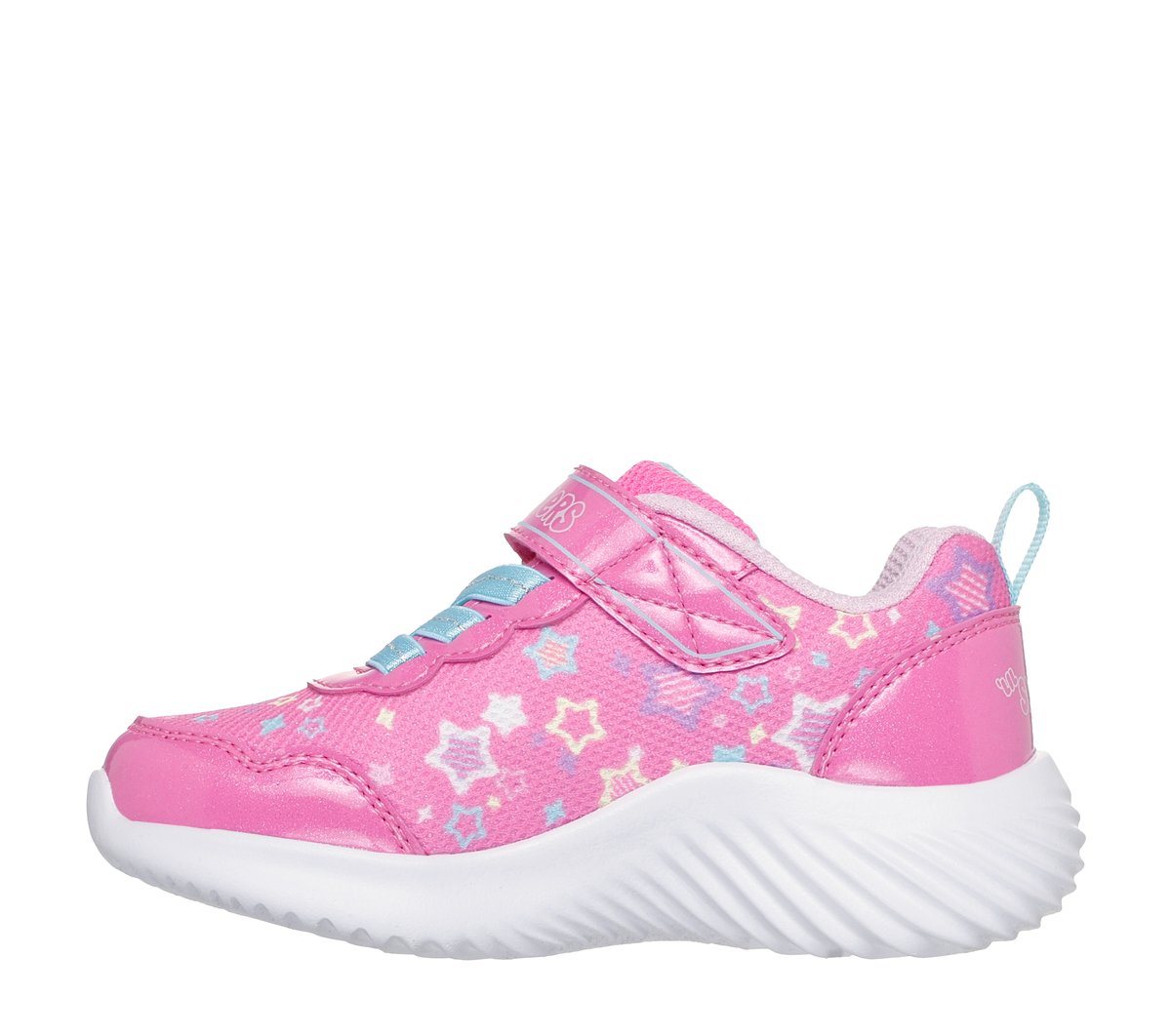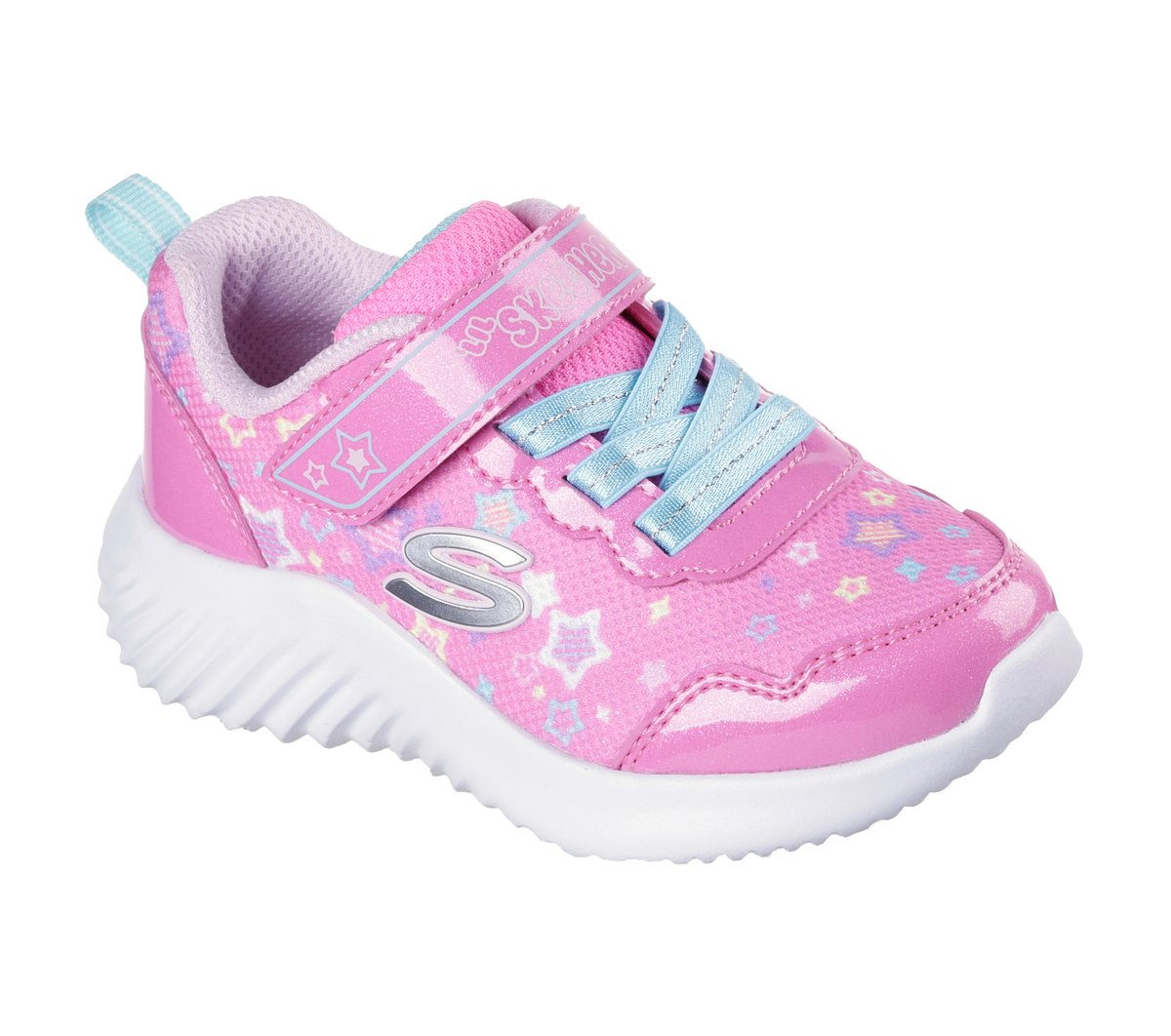 Feet-loving comfort and stellar style combine in Skechers Bounder – Lil Star Friend. This Skechers adaptive closure design features a star-printed mesh and synthetic overlay upper with stretch laces, an adjustable instep strap, and a cushioned comfort insole.