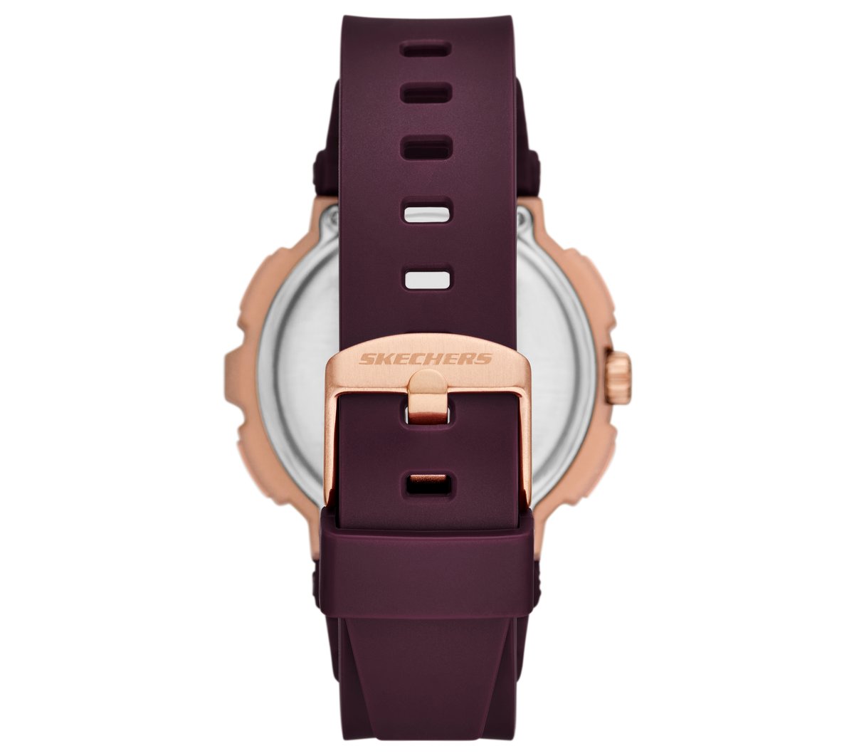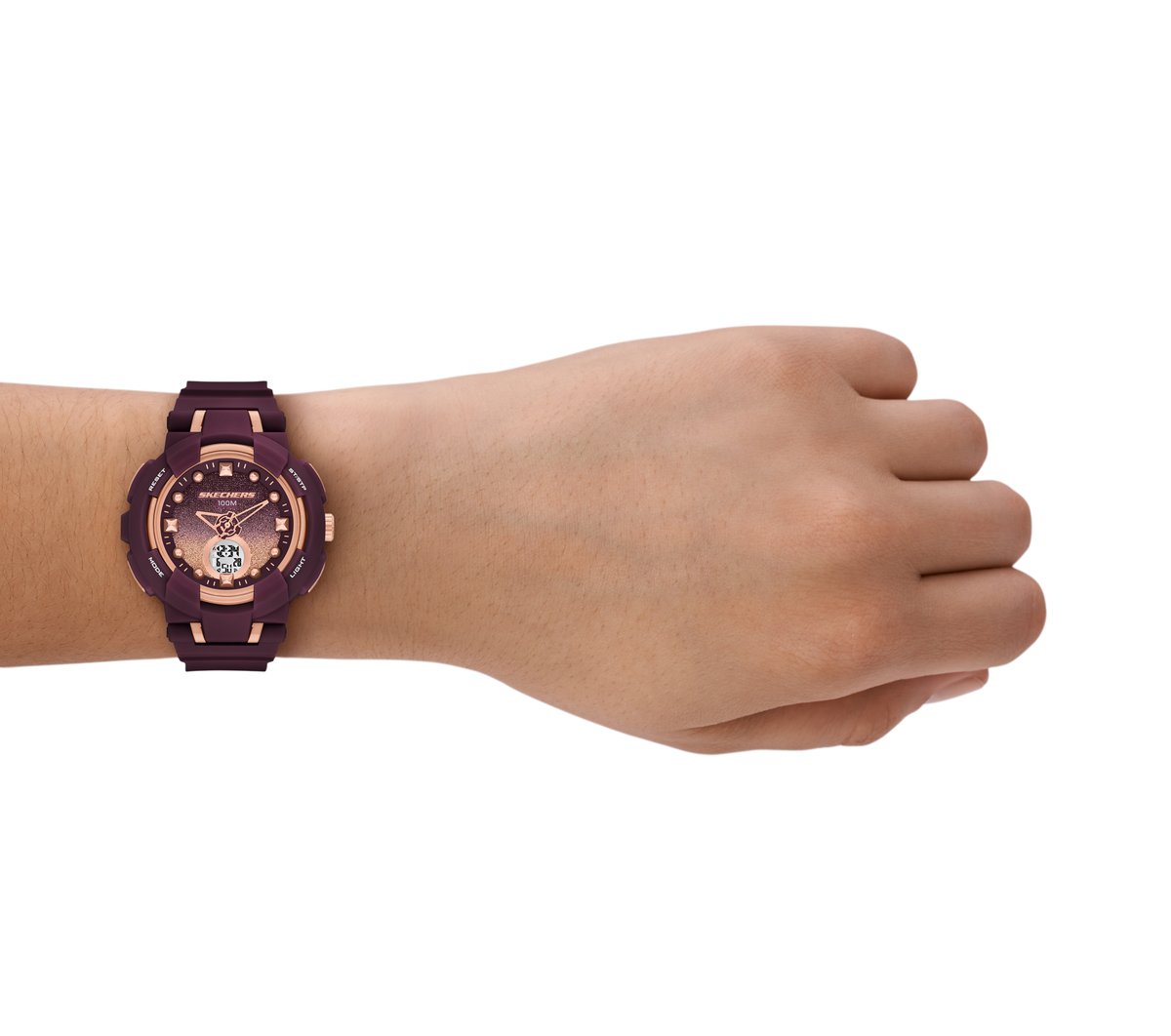 Add some sparkle to your sporty style with Skechers Brynwood Watch. This Ana-Digi sport watch features a round 42mm case with a glittery multicolor dial, a durable plastic construction with bronze accents, and an adjustable comfort strap. Water resistant up to 100 meters.