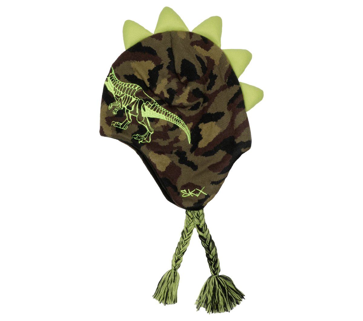 Cold weather can’t stop a good adventure with Skechers 3D Camo Hat and Glove Set. This knit alpine style hat features plush poly lining, braided tassel pulls, dino-themed graphics and 3D detail, plus a pair of coordinating solid color gloves.