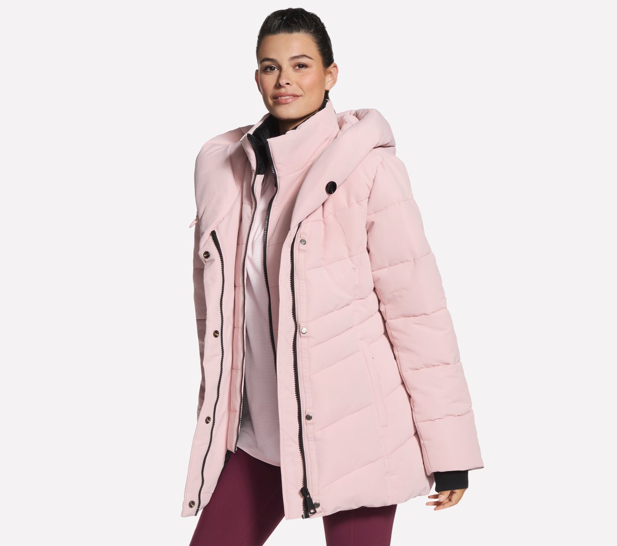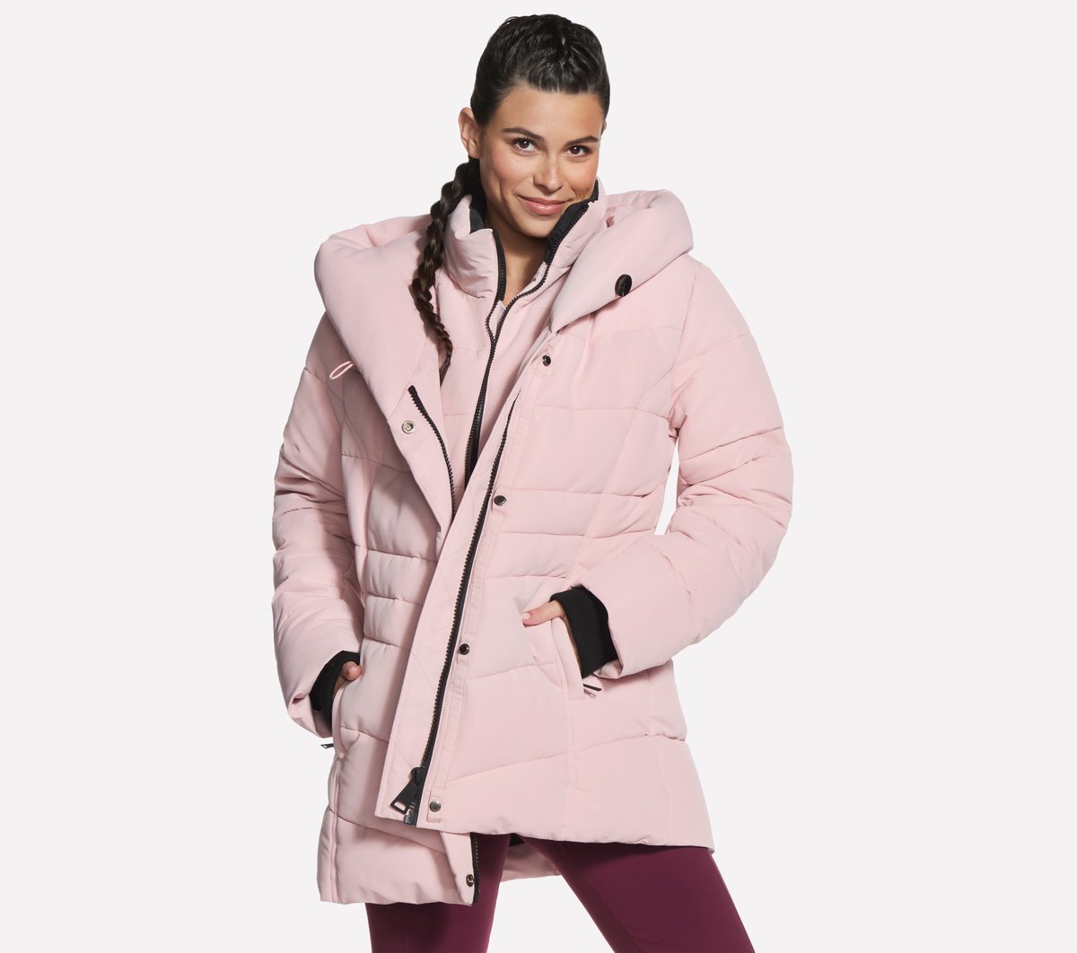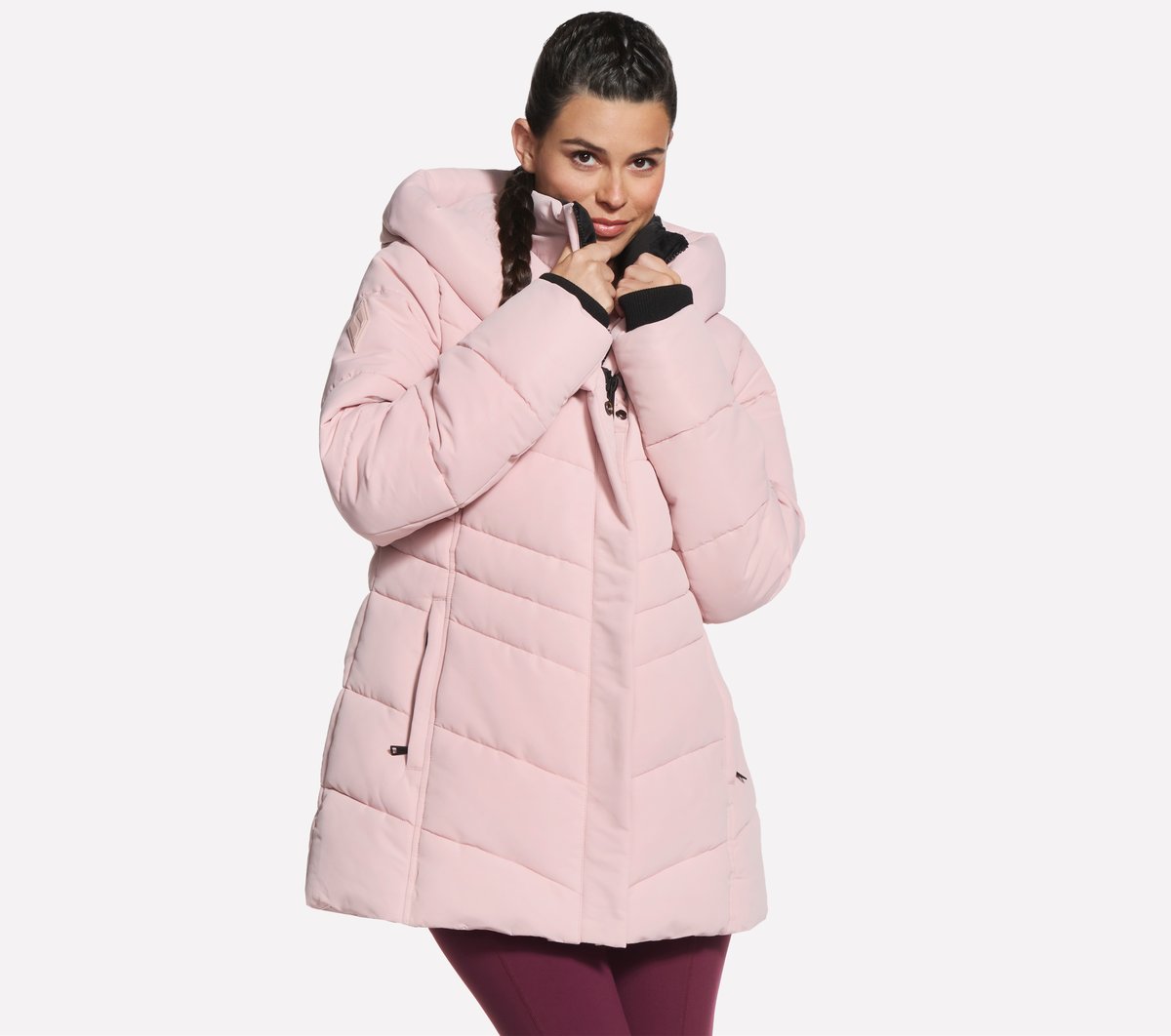 Meet your favorite cold-weather companion in Skechers Cozy & Covered Puffer. Insulated with eco-down fill, this hooded jacket is made from our water-repellent and wind-resistant fabric to keep you warm in extreme cold weather. It features a full-zip front with snap button closures, zippered hand pockets, and inner storm cuffs to help seal out the cold.
