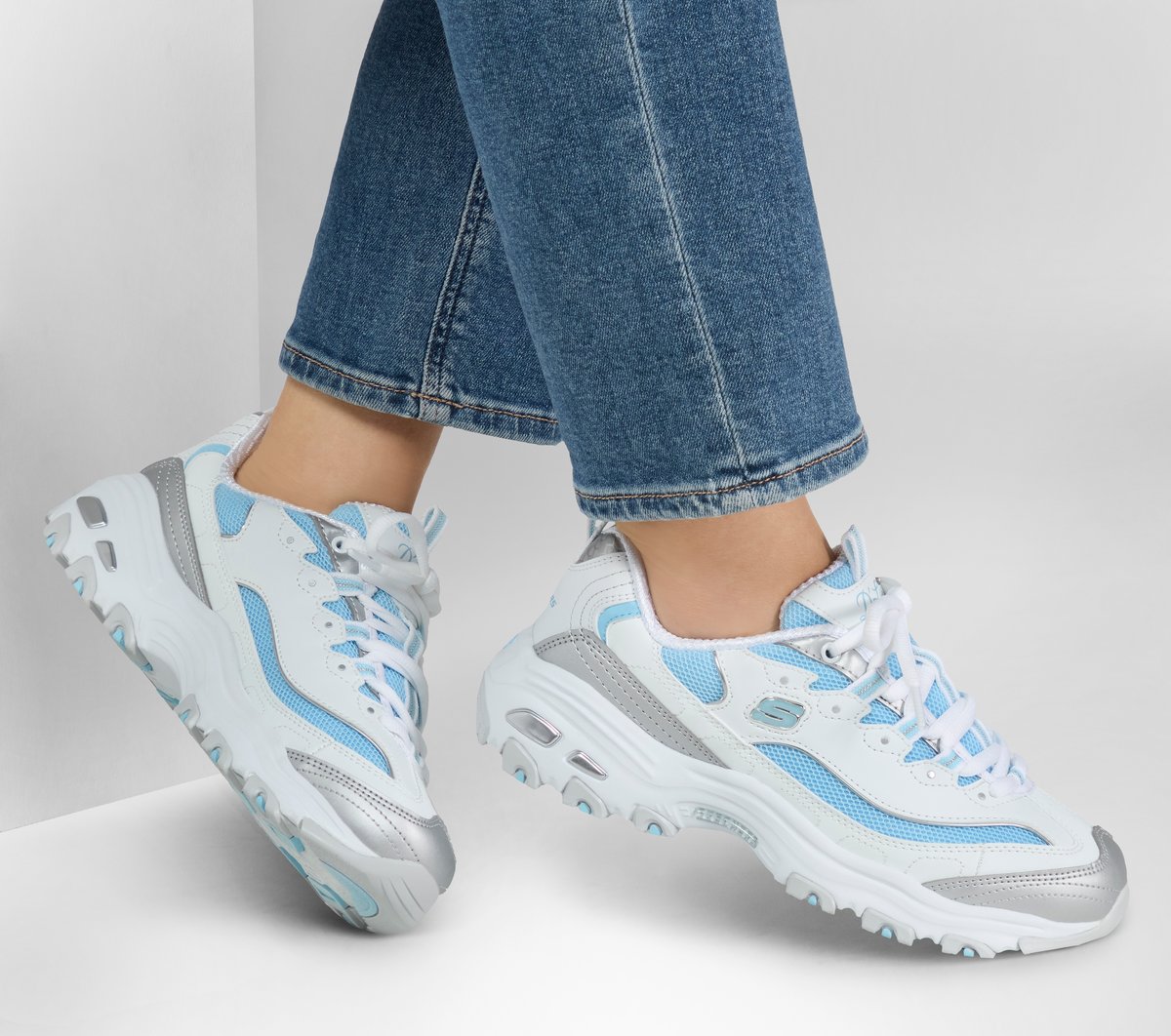 Step out in iconic style and comfort wearing Skechers D’Lites® – Chromatic. This casual lace-up style features a mesh upper with duraleather overlay, metallic details, a cushioned Skechers Air-Cooled Memory Foam® insole, and a shock-absorbing midsole.