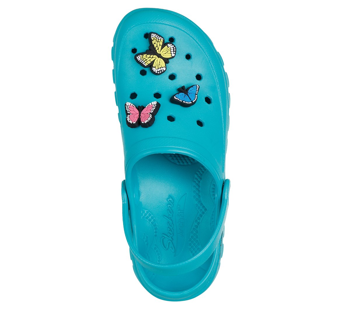 Enjoy the sunshine in cozy comfort with Skechers Foamies®: Arch Fit® Footsteps – Butterfly Dreams. This Arch Fit® comfort clog has been granted the APMA Seal of Acceptance and features a molded Foamies® upper with removable butterfly charms and a Luxe Foam® contoured cushioned footbed.