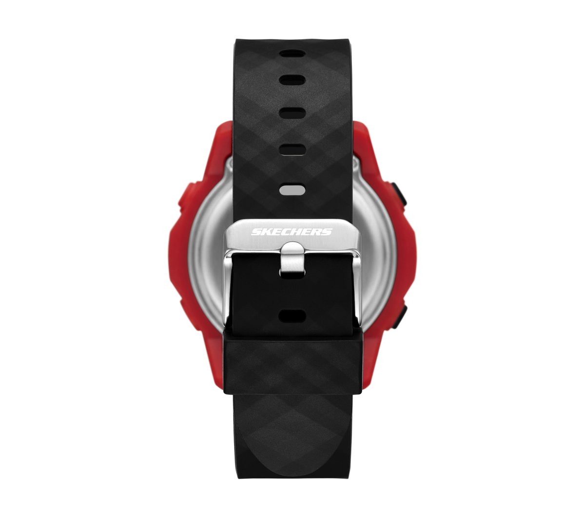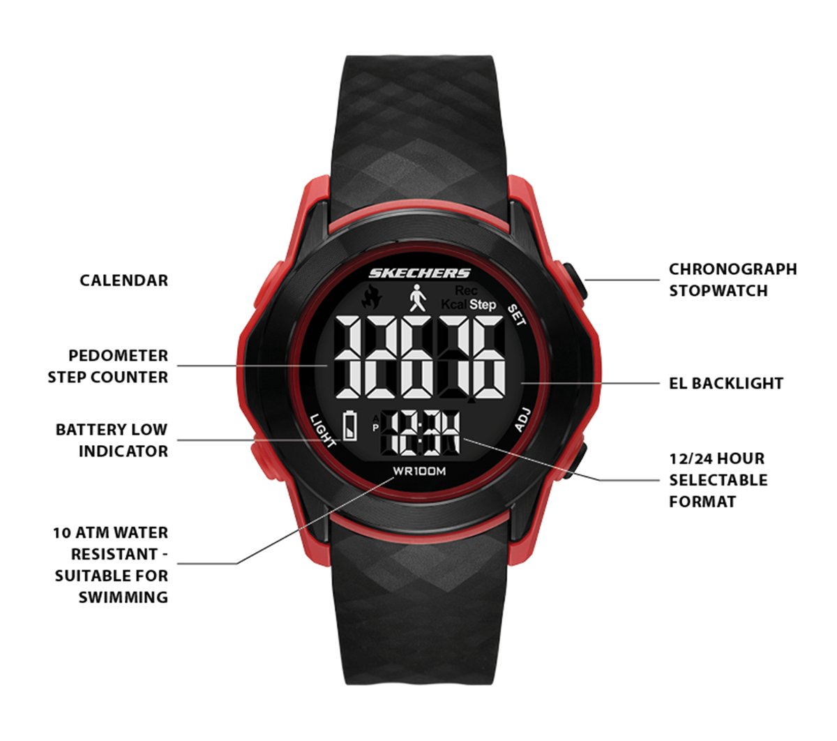 Elevate your everyday style with the Skechers Galloway Watch. This lightweight design features a round 47mm polycarbonate case with an easy-to-read negative display, a digital movement for precise timekeeping, a durable mineral crystal lens, and a comfortable black plastic strap. Water resistant up to 100 meters.