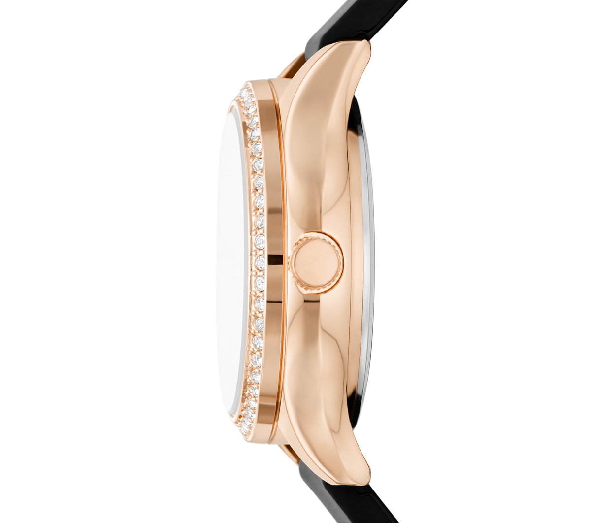 - Elegant rose gold analog display with rhinestone bezeled face trim