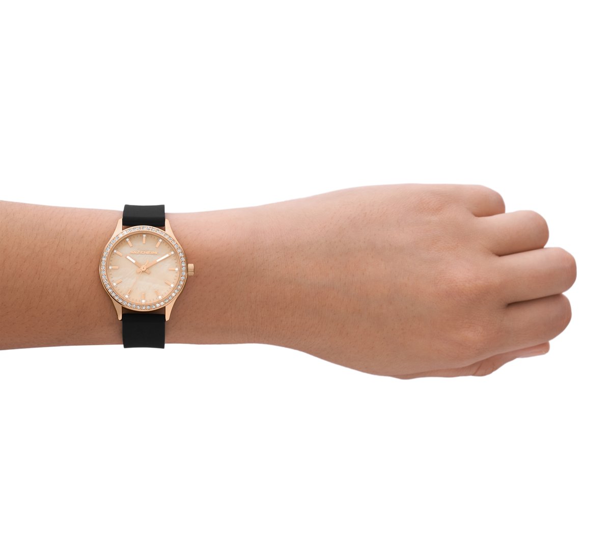 Bring a touch of elegance to your time-keeping style with the Skechers Glyndon Black Watch. This rhinestone trimmed watch features a rose gold analog display with a manual control knob and a silicone wristband.