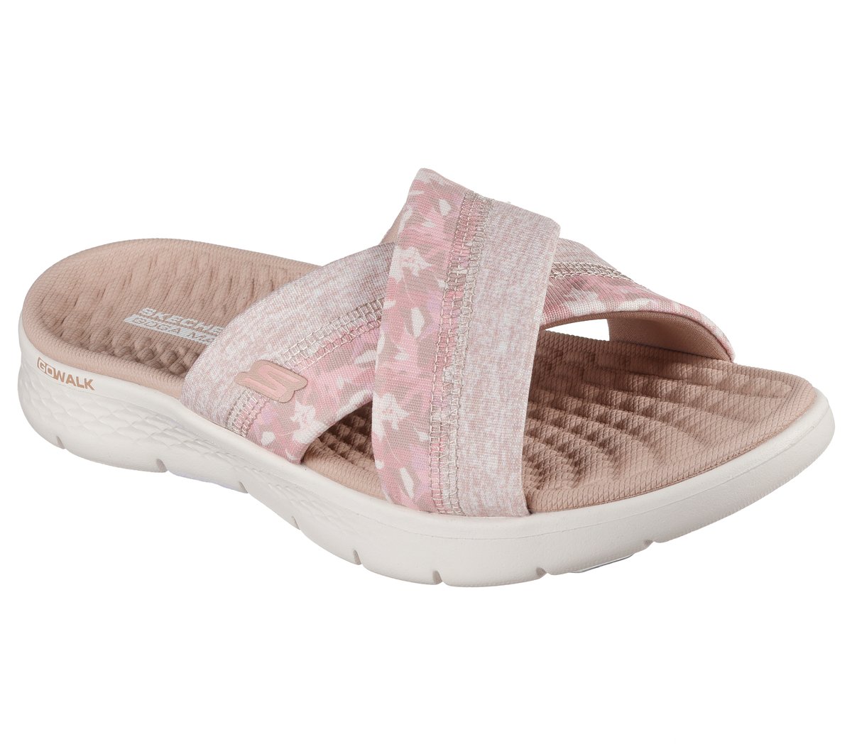 Choose the easy life in laid back style wearing Skechers GO WALK Flex™ Sandal – Elsa. This Memory Foam infused cross strap sandal features a floral print woven fabric upper, contoured Goga Mat® footbed, and lightweight ULTRA GO® cushioning.