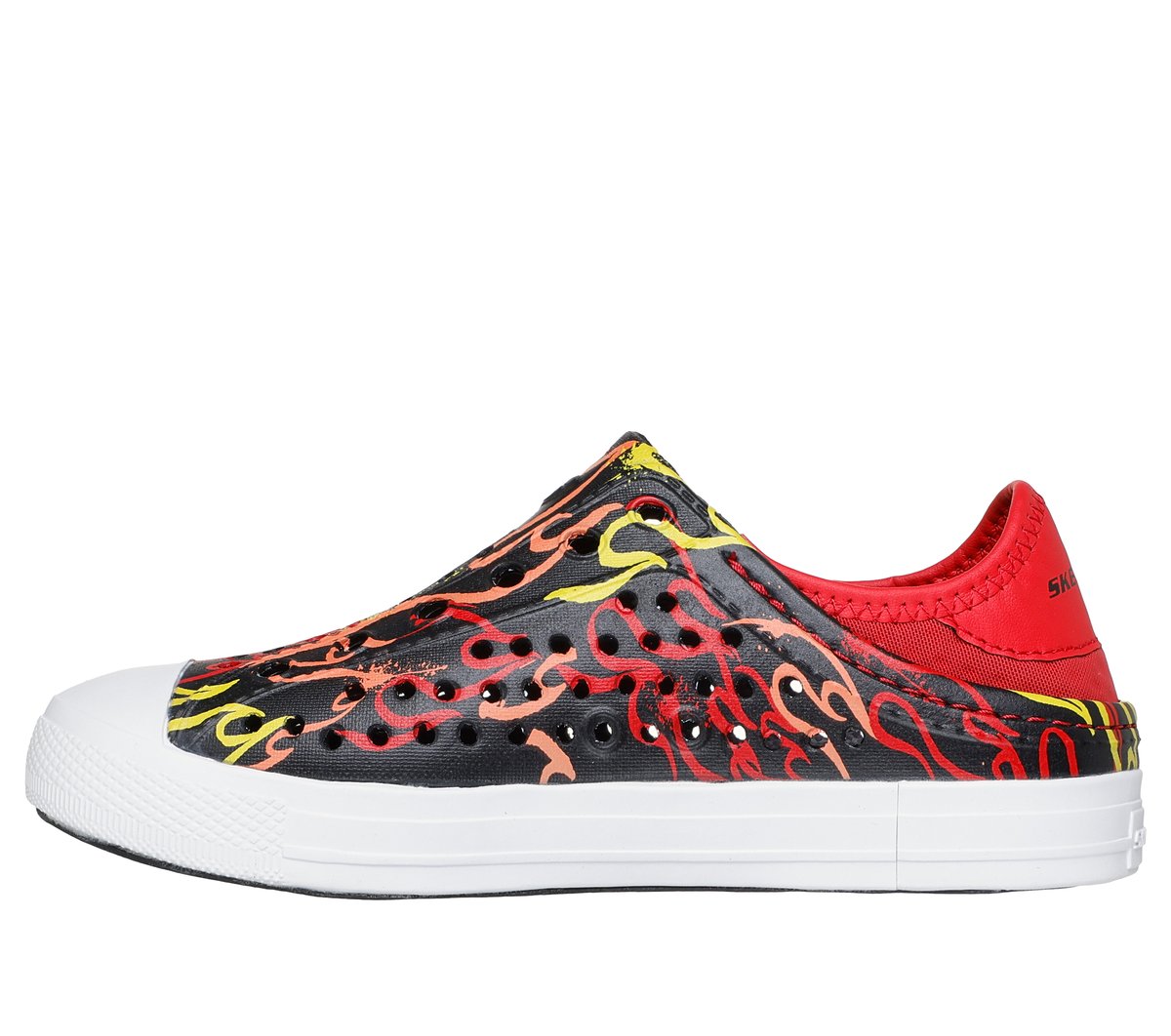 Take another lap in a warm weather favorite with Skechers Foamies®: Guzman Steps – Print-Splash. This water-friendly sneaker features a perforated Foamies® EVA upper in an allover flames or race car print with a collapsible fabric heel.