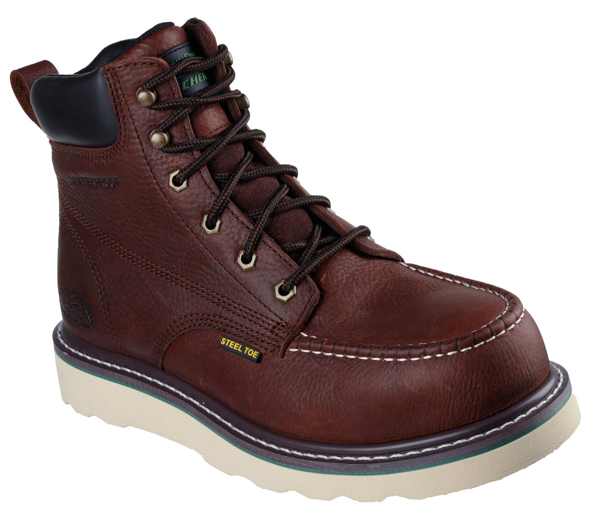 Stay dry in all-day comfort with Skechers x John Deere Waterproof: Kadmiel – Rockworth. This waterproof lace-up work boot features a leather upper with padded collar, steel safety toe, and a Skechers Air-Cooled Memory Foam® cushioned insole.