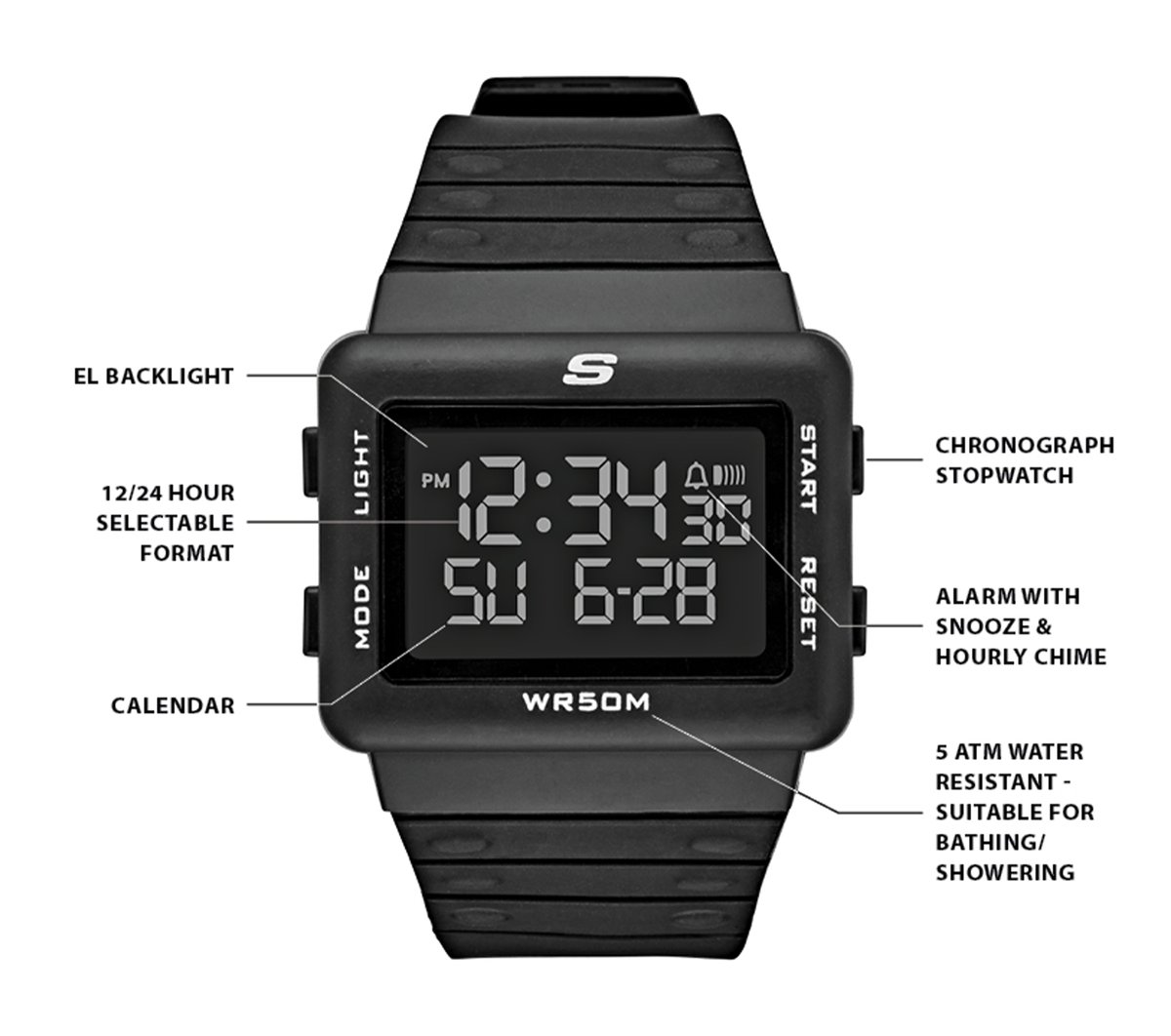 Work all of the angles in retro-cool style with the Skechers Larson Watch. Rectangular case design in a digital chronograph watch with multiple features and flexible band.