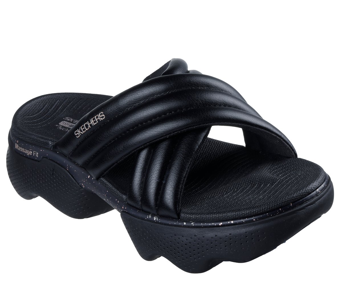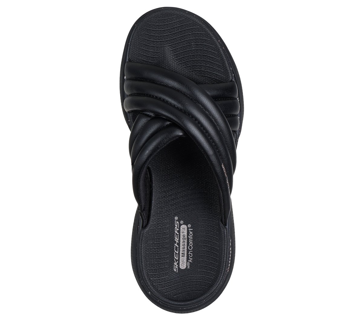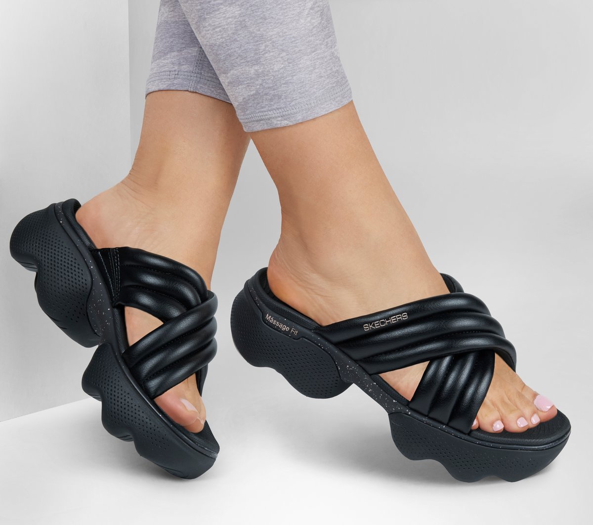 Ease back in standout style and summery comfort with Skechers: Massage Fit Edge – Sky High. This vegan crossband slide sandal features a quilted synthetic leather upper, a contoured Goga Mat® footbed with Arch Comfort® for added support, and a speckled Massage Fit™ midsole that massages your foot with every step.
