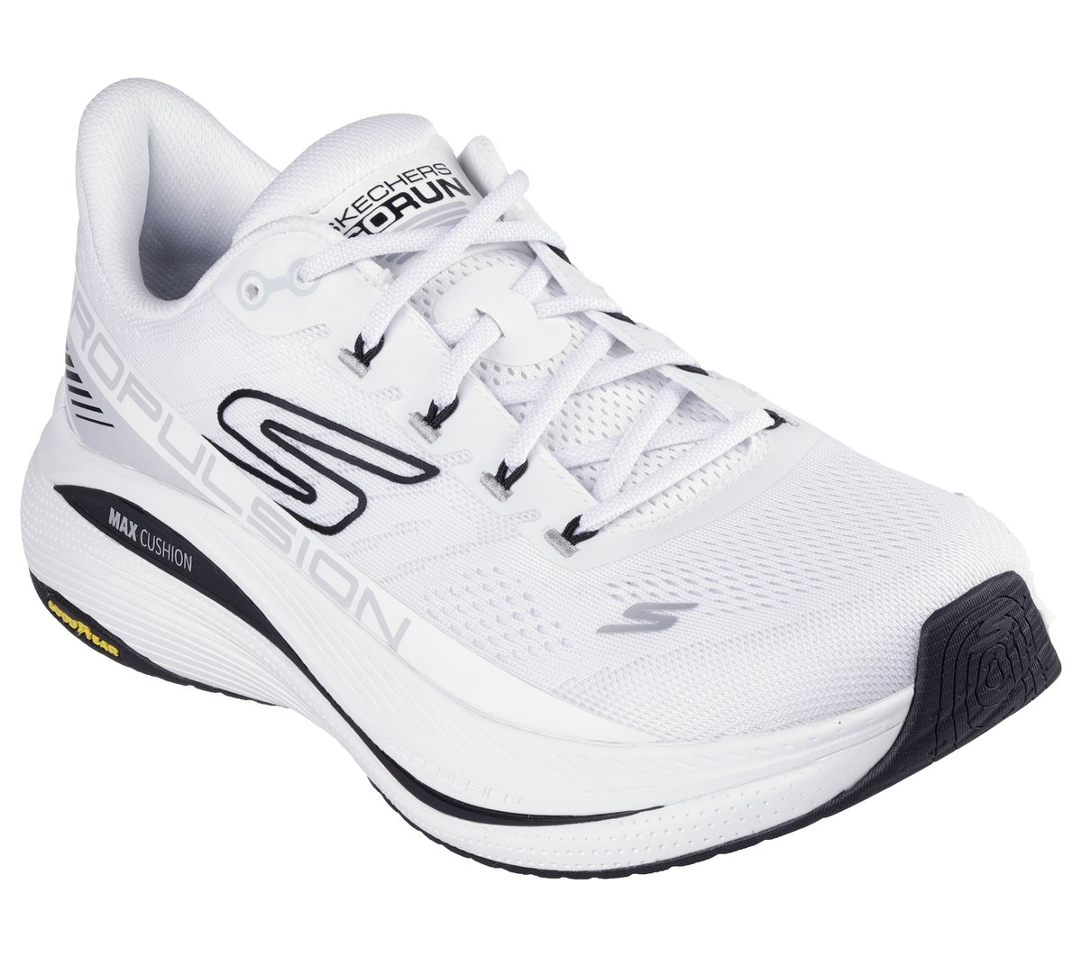 Elevate your performance in ultimate comfort wearing Skechers Max Cushioning® Propulsion. This vegan running design features an engineered mesh upper with ‘Propulsion’ side graphic, Skechers Air-Cooled Goga Mat™ insole, an exceptionally comfortable Max Cushioning® midsole with ULTRA FLIGHT® cushioning and responsive TPU plate, all on a Goodyear® Performance Outsole.