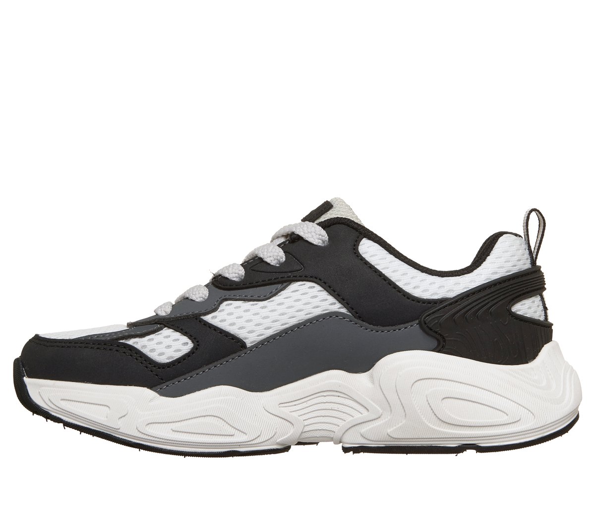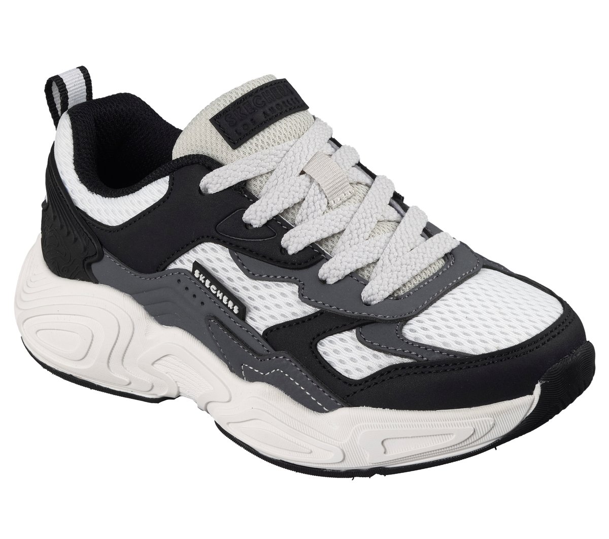 Shake things up on the playground wearing Skecher Street™: Mega-Quake. This lace-up fashion sneaker features an active mesh upper with stacked synthetic overlays, sculpted midsole and heel cup detail, plus a Skechers Air-Cooled Memory Foam® insole.