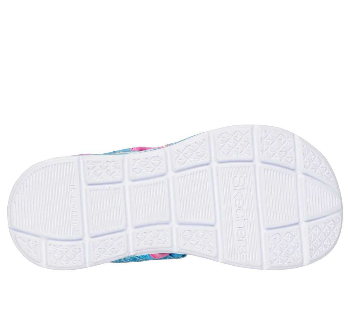 Sparkle and shine in under the ocean style wearing Skechers Mermaid Dreams Sandal. This open-toe Magical Collection® sandal features a mesh and synthetic glitter finish upper with Skechers adaptive closure, mermaid themed light-up graphics, and a cushioned comfort footbed.