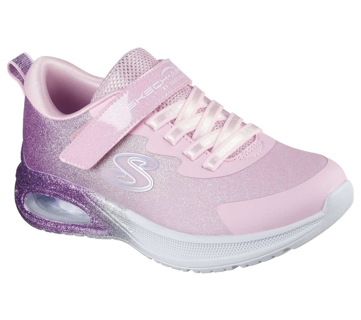 Play all day in sporty comfort and sparkly style wearing Skechers Microspec Max Advance – Glitz Gala. This Skechers adaptive closure design features a sparkle mesh and synthetic upper with ombre glitter spray, stretch laces, an adjustable instep strap, and a visible Skech-Air® airbag midsole.
