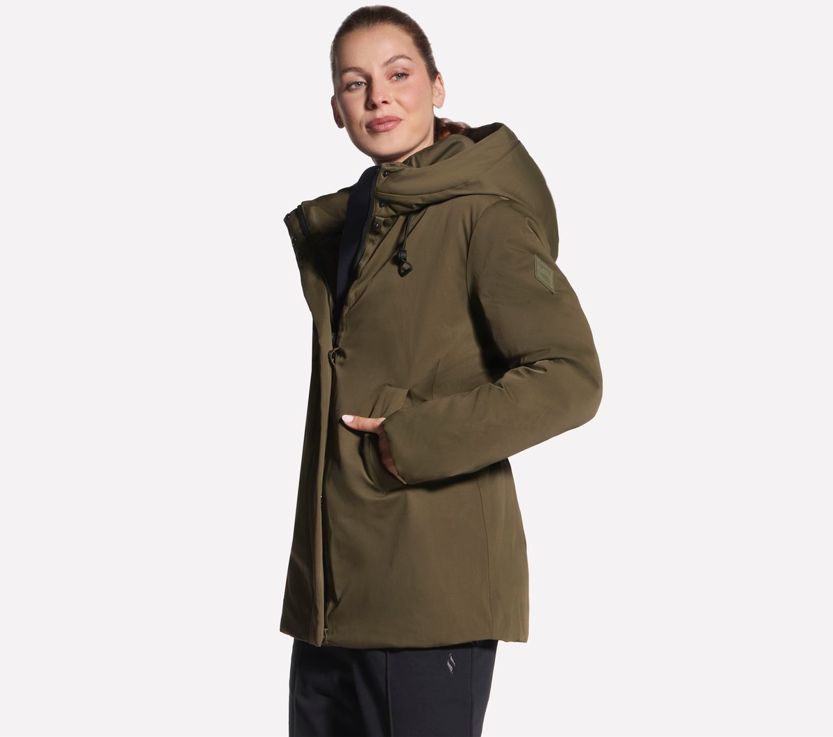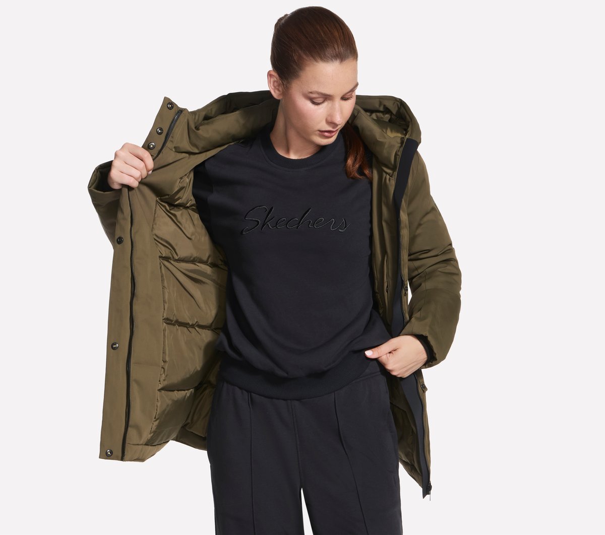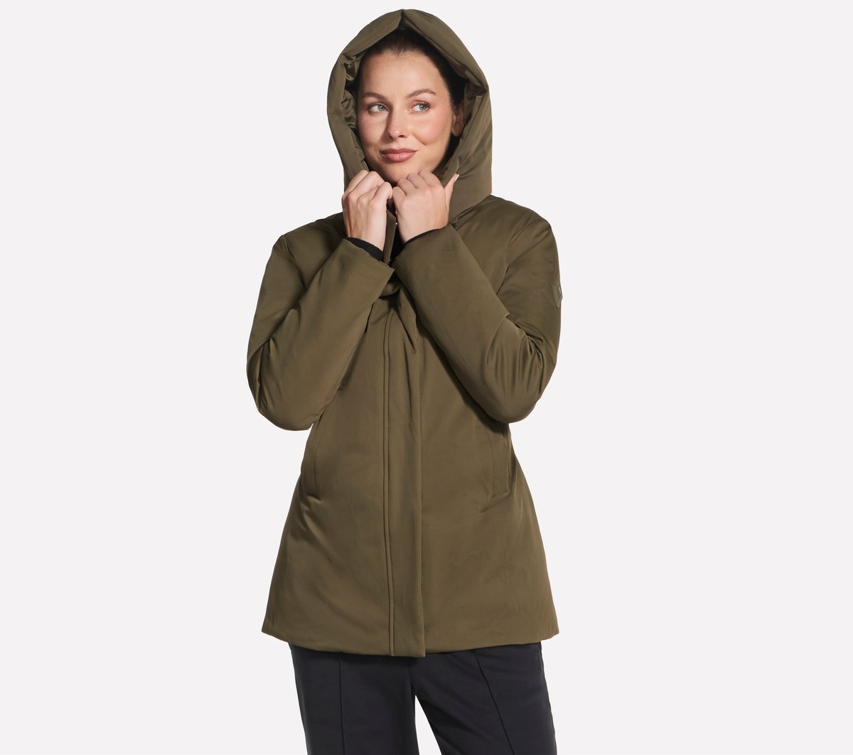 Embrace the elements in warmth and sleek style with Skechers Minimalist Parka. Designed for extreme cold weather, this mid-length hooded jacket is insulated with eco-down fill and made from our water-repellent and wind-resistant fabric for superior protection. It features a full-zip front with snap button closures, snap-close hand pockets, and an inner waist adjuster.