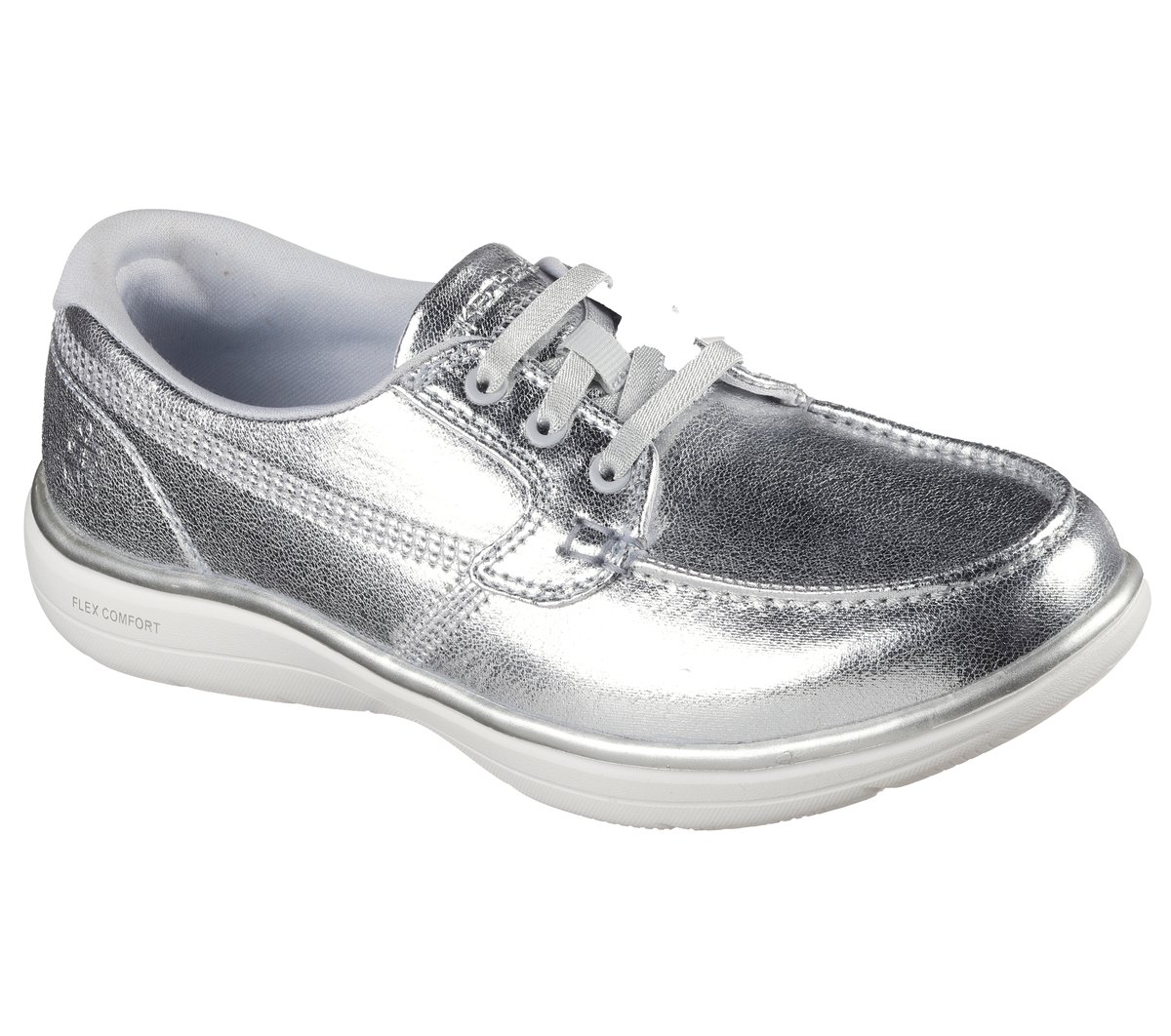 Stylish and versatile comfort combine in Skechers On-the-GO® Flex Radiant – Gleam. This skimmer style features a metallic coated canvas upper, high-rebound Skechers Air-Cooled Goga Mat™ insole, and lightweight ULTRA GO® cushioning.