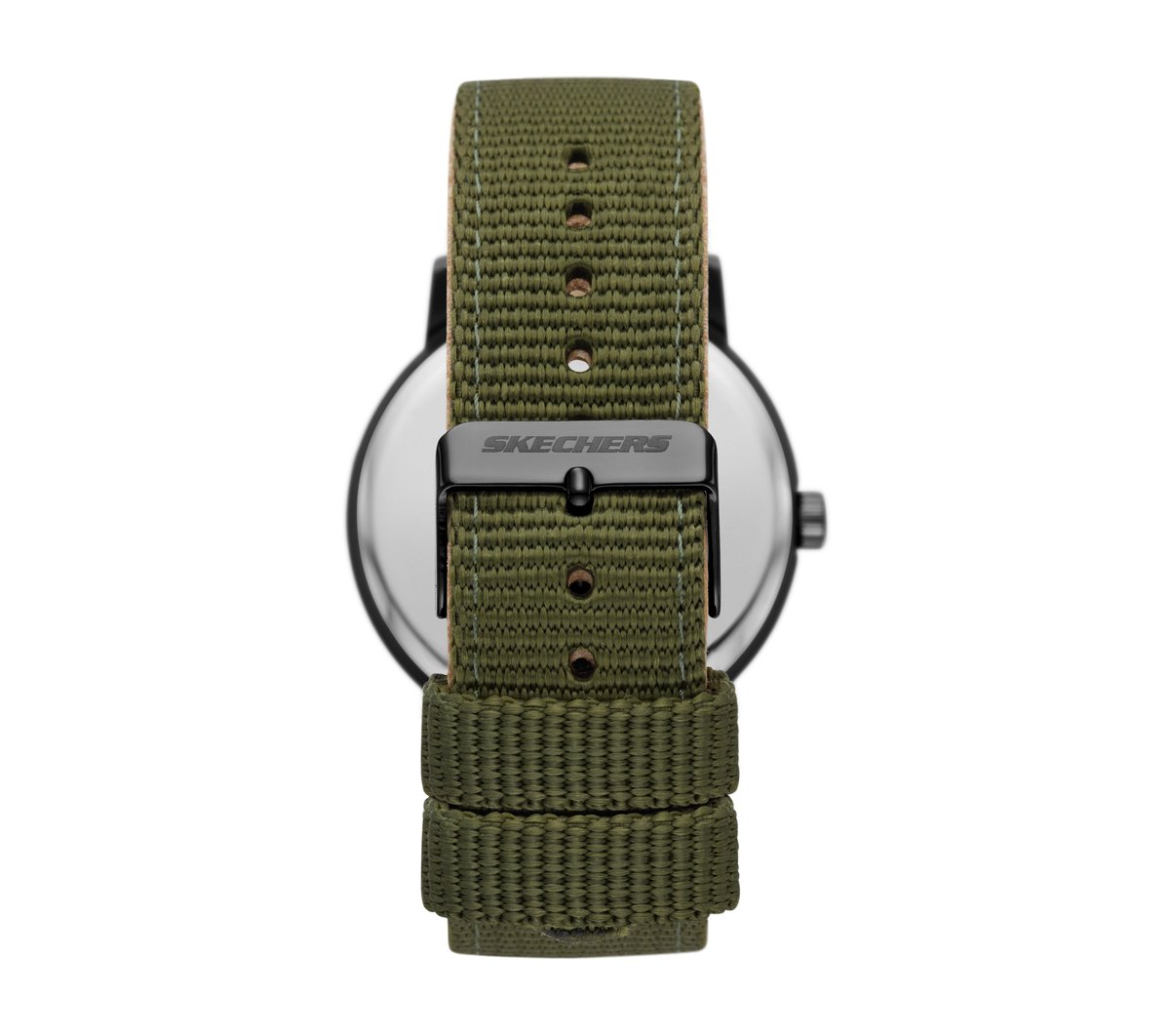 Find your way on time and in style with Skechers Parkhurst Green Watch. This casual design features an analog display with a manual control knob, plus a canvas wristband with a stainless steel clasp and a mini compass.