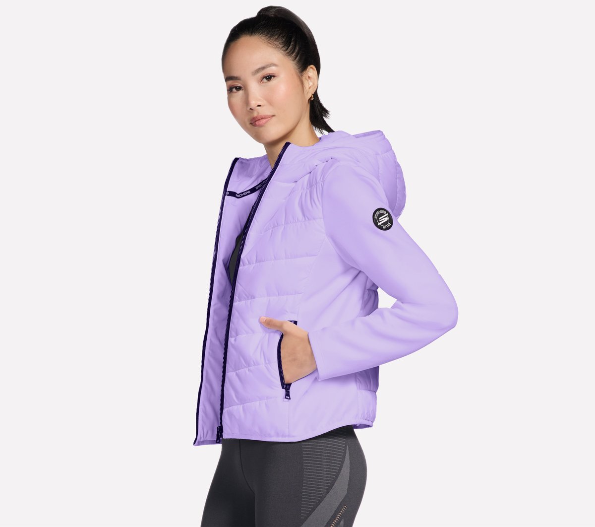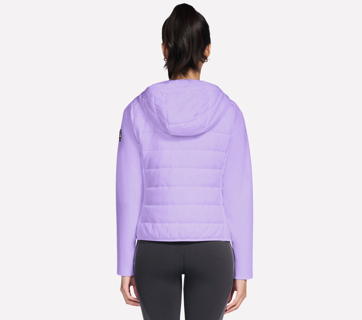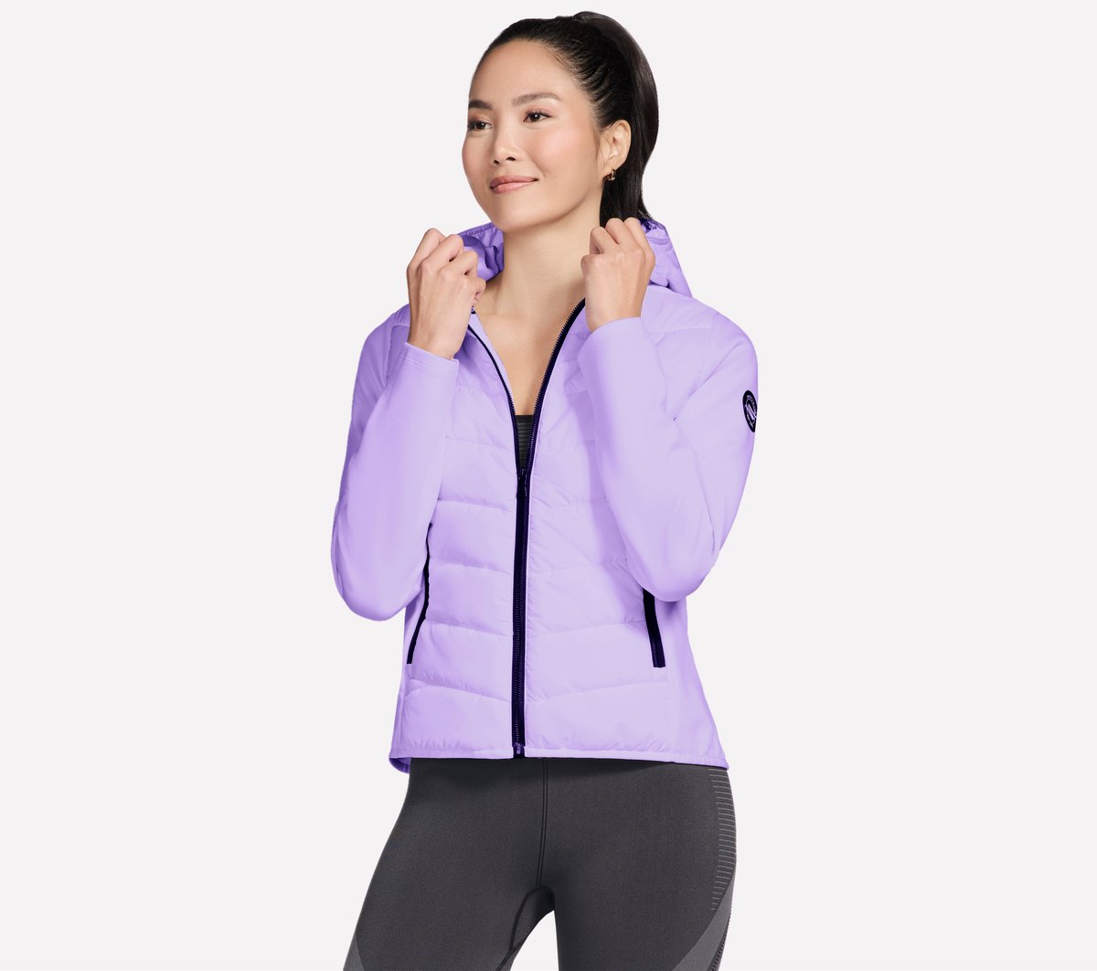 Make a warm and cozy style statement wearing Skechers Performance™ Elite Cozy Fit® Hooded Jacket. This full-zip hooded hybrid jacket is made from our lightweight GO SHIELD™ Cozy Fit® fabric and features quilted front and back panels with princess seams, knit sleeves and side panels, contrast zipper detail, and zippered hand pockets.