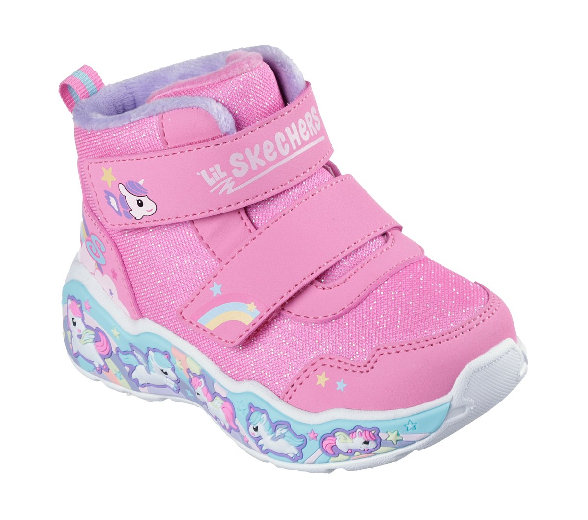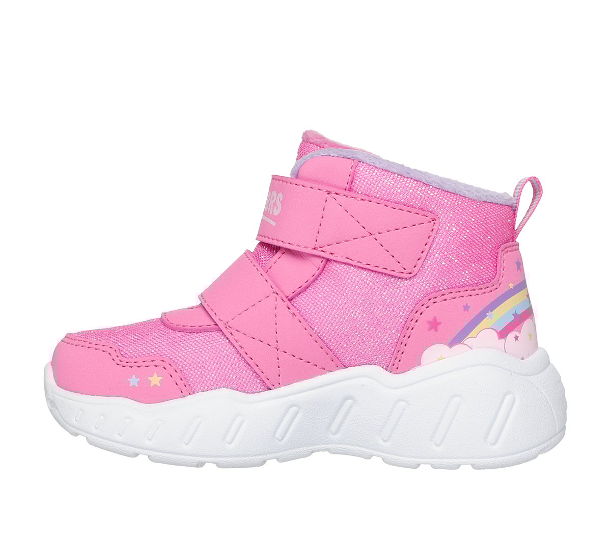 Your little one will be smiling all day long wearing Skechers Play Scene. This Skechers adaptive closure boot features a glittery mesh upper with synthetic overlays, cozy faux fur lining, adjustable instep straps, and a well-cushioned midsole with playful themed graphics.