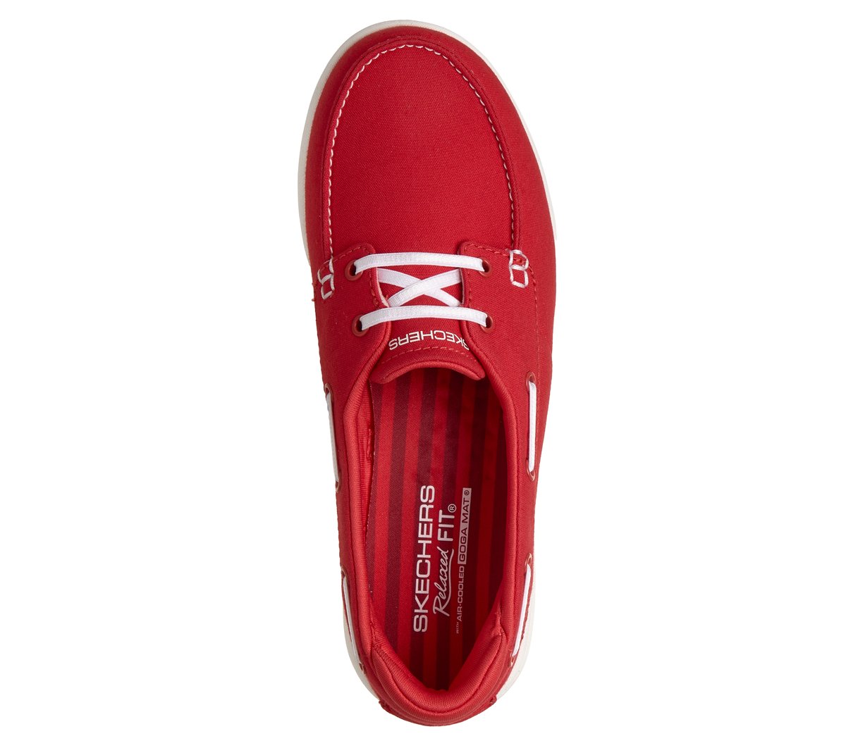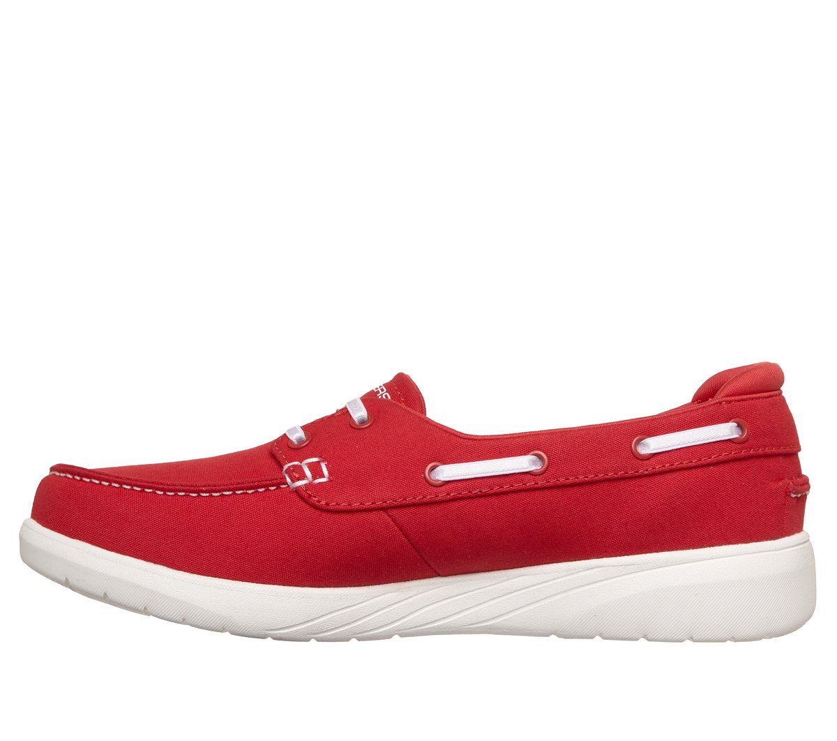Suit up for comfort on and off the deck in Skechers Relaxed Fit®: Flex Adapt – Oceanside. This easy-on vegan boat shoe features a canvas upper with fixed stretch laces, a Skechers Air-Cooled Goga Mat™ insole, and lightweight ULTRA GO® midsole cushioning.