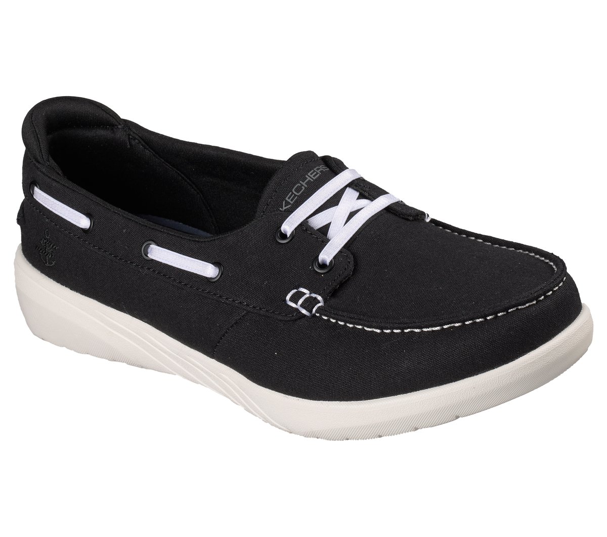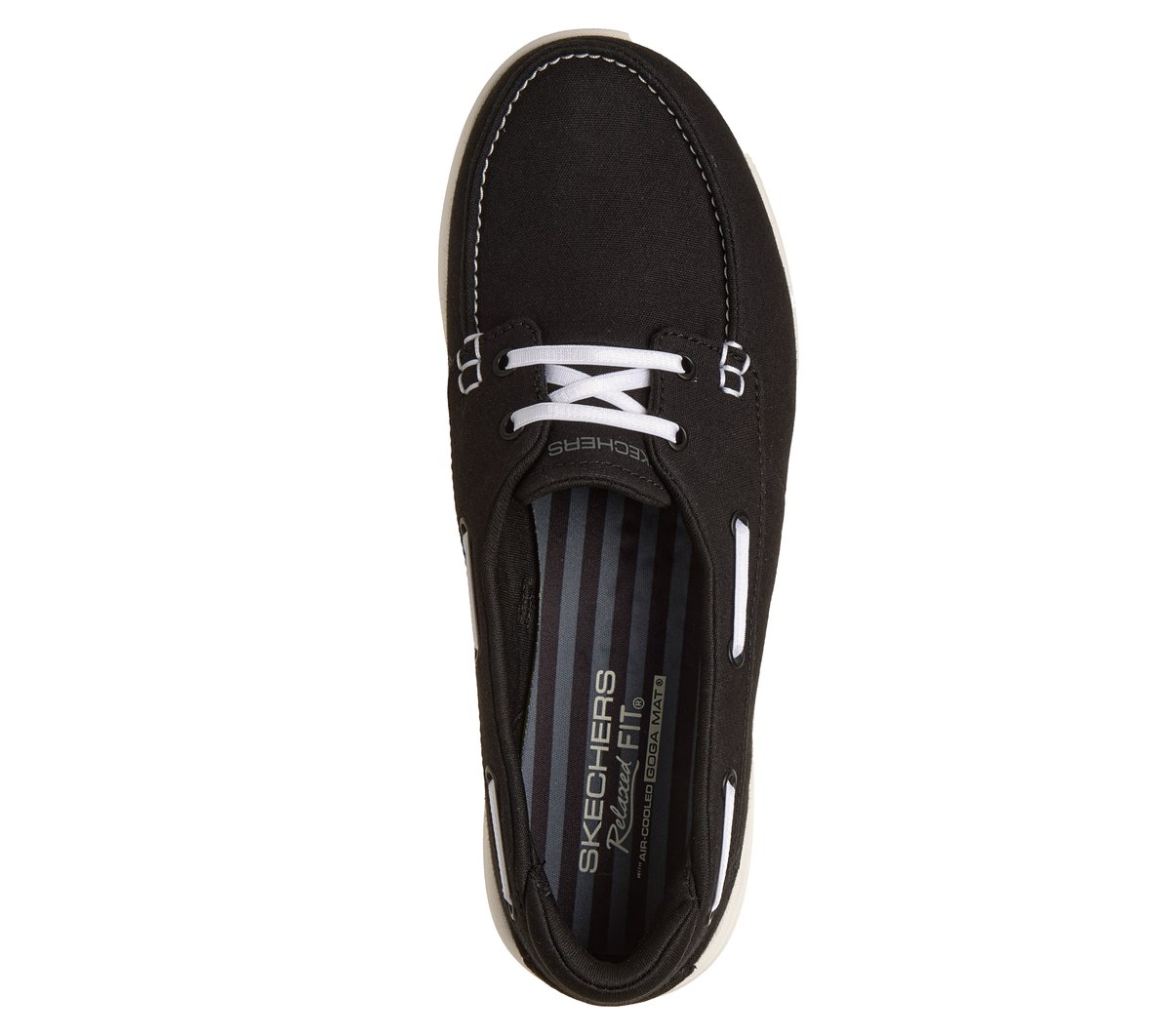 Suit up for comfort on and off the deck in Skechers Relaxed Fit®: Flex Adapt – Oceanside. This easy-on vegan boat shoe features a canvas upper with fixed stretch laces, a Skechers Air-Cooled Goga Mat™ insole, and lightweight ULTRA GO® midsole cushioning.