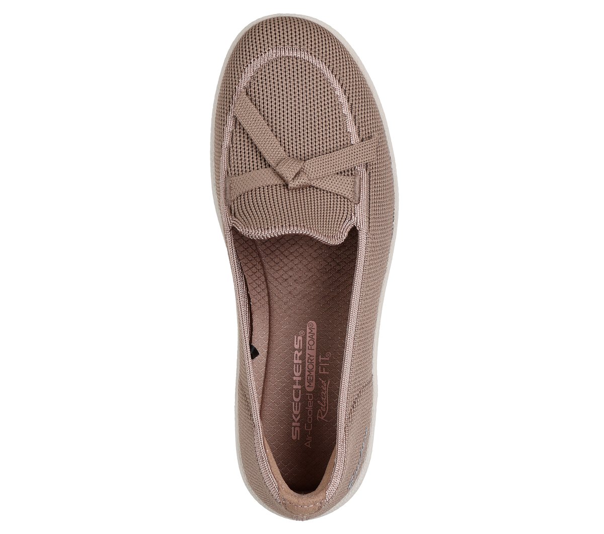 Fashionable flair and comfort combine in Skechers Relaxed Fit®: Parallel Lite – Soaring Softly. This casual fashion wedge features a Stretch Fit® textured knit upper with a bow front and a cushioned Skechers Air-Cooled Memory Foam® insole.