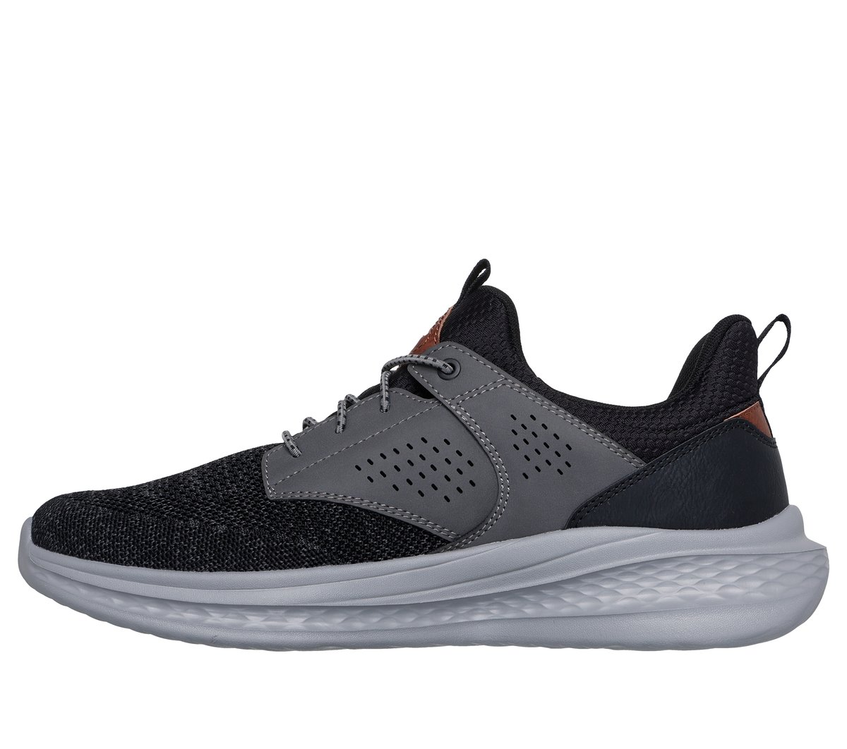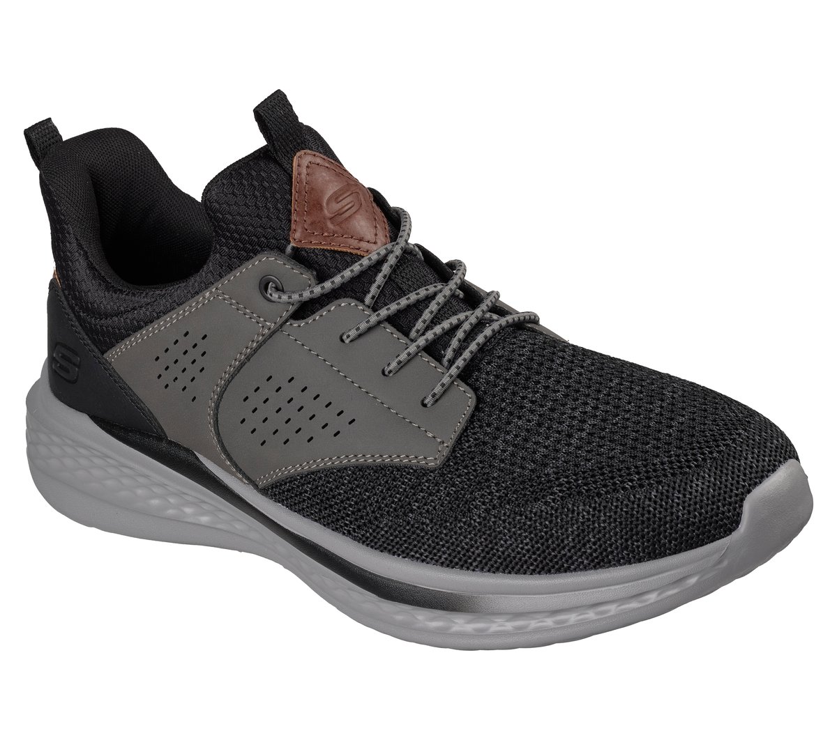 Classic modern style combines with comfort in Skechers Relaxed Fit®: Slade – Breyer. This stretch-laced vegan style features a mesh and synthetic upper with a charcoal-infused Skechers Air-Cooled Memory Foam® insole and a Skechers Goga Mat Arch™ for added support.