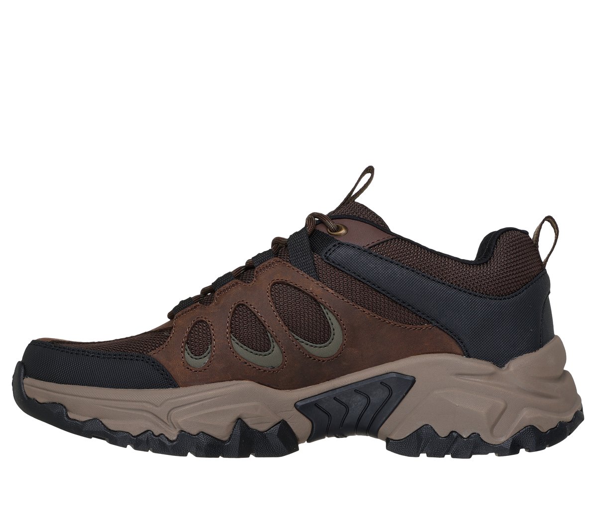 Embark on a new adventure in rugged comfort with Skechers Relaxed Fit®: Terraform – Selvin. This lace-up outdoor trail design features a water-repellent treated leather and mesh upper with an Air-Cooled Memory® insole and durable Goodyear® Performance Outsole.