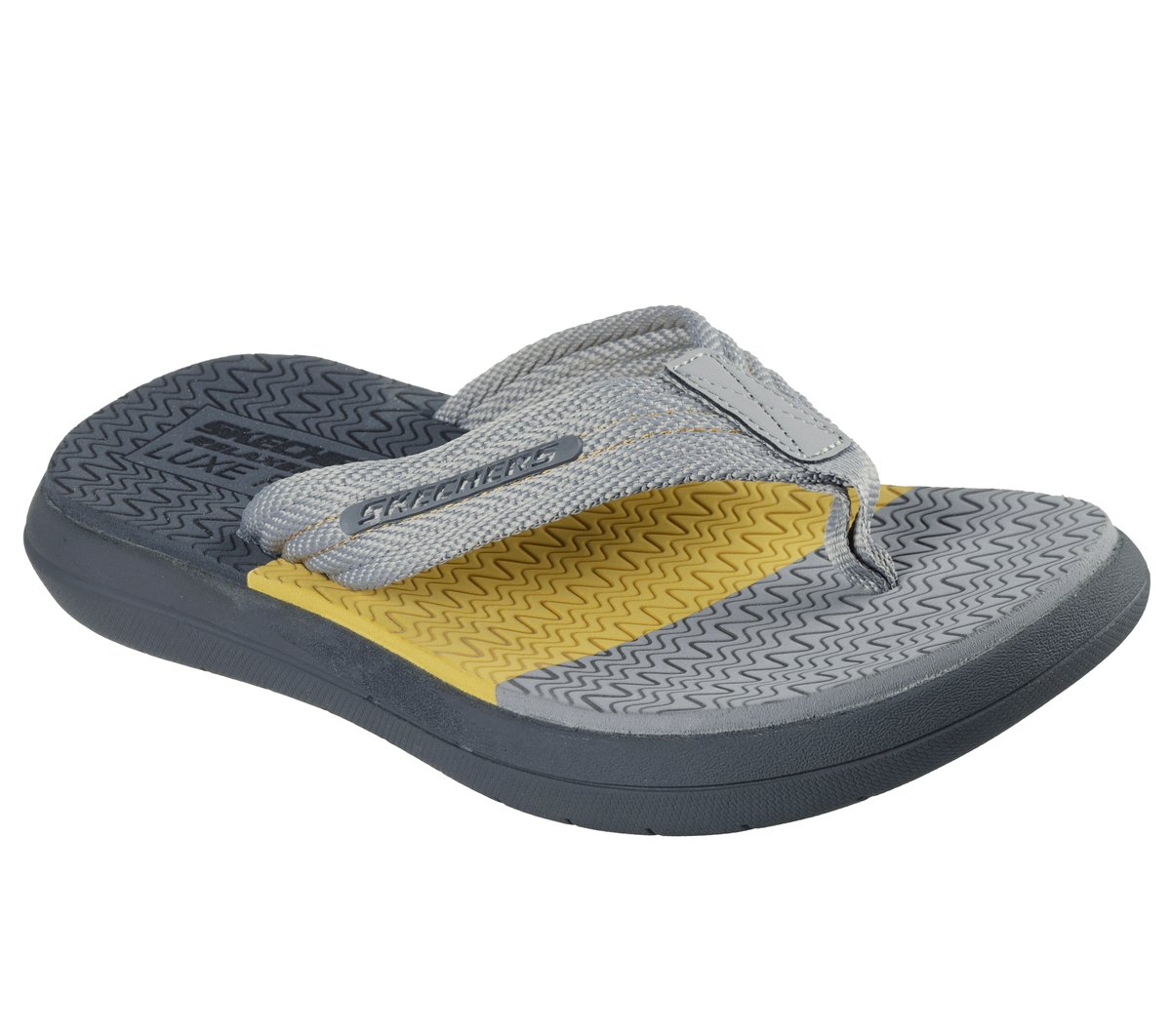 Bring on the sand, surf, and sun in Skechers Relaxed Fit®: Voreno Codie. This roomy 3-point thong sandal features a woven canvas upper and a contoured Luxe Foam® footbed.
