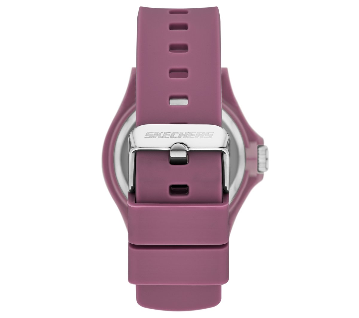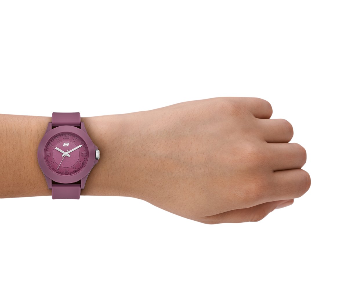 Make a statement with Skechers Rosencrans Watch. This analog fashion watch features a round 40mm mauve case with embossed dial details and silver accents, PC and stainless steel construction, and an adjustable silicone strap with silver buckle. Perfect for adding rich color to your look.