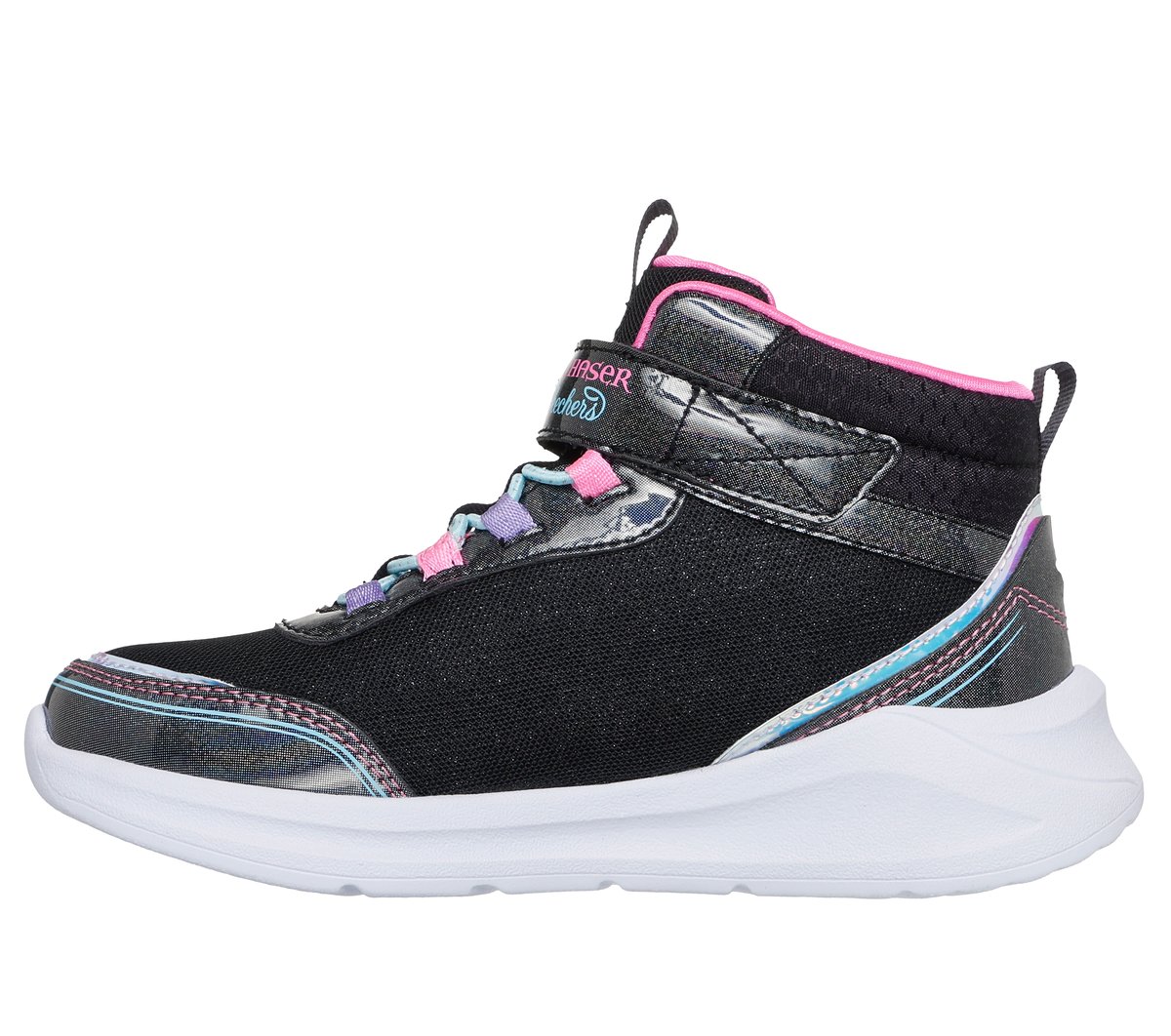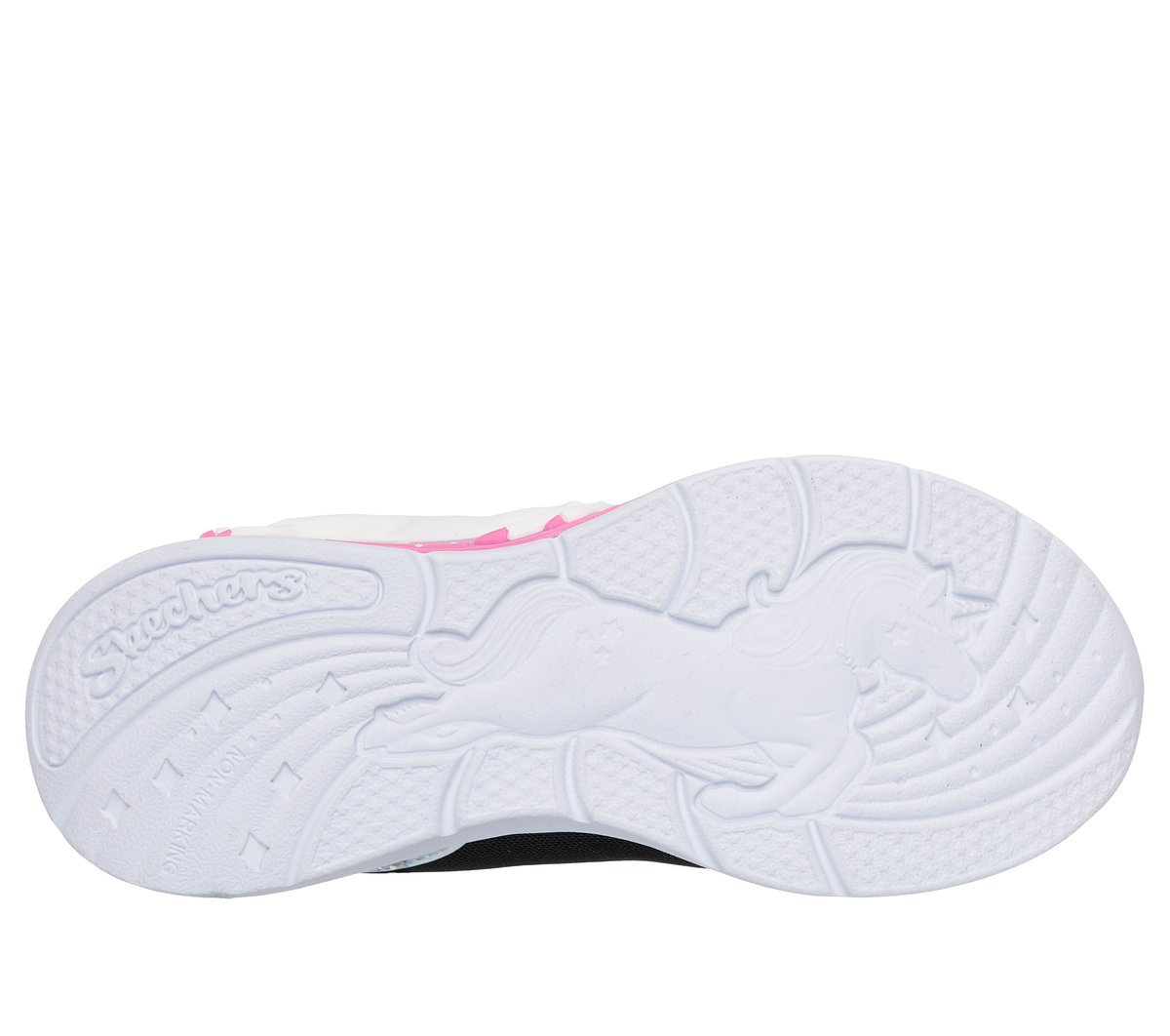 Sparkle and shine in light-up style wearing Skechers S-Lights®: Unicorn Chaser – Jumping Magic. This Skechers adaptive closure mid-top design features a glittery synthetic upper with light-up unicorn and rainbow side graphics, stretch laces, an adjustable instep strap, and a cushioned comfort footbed.