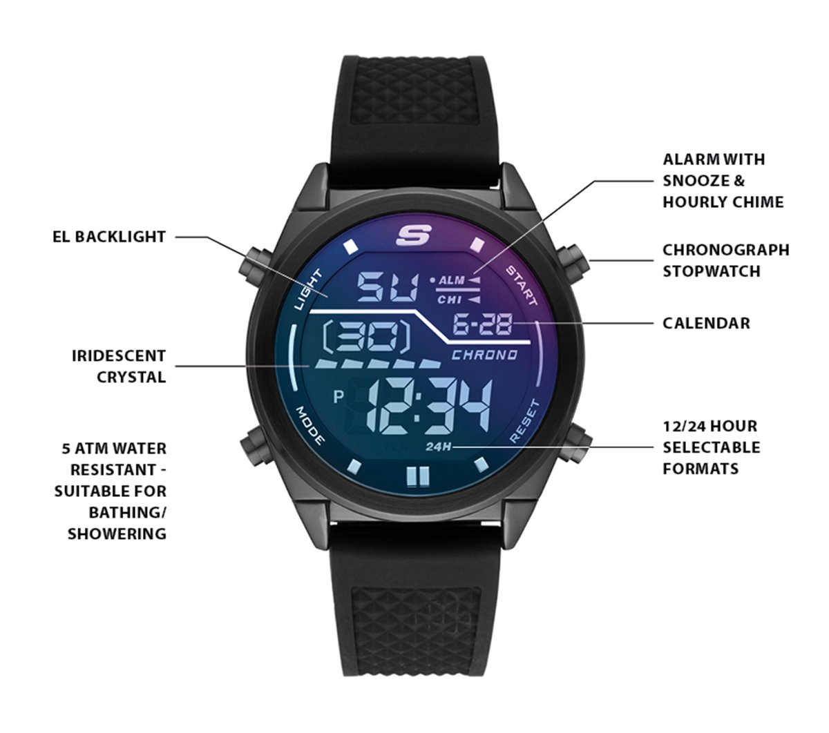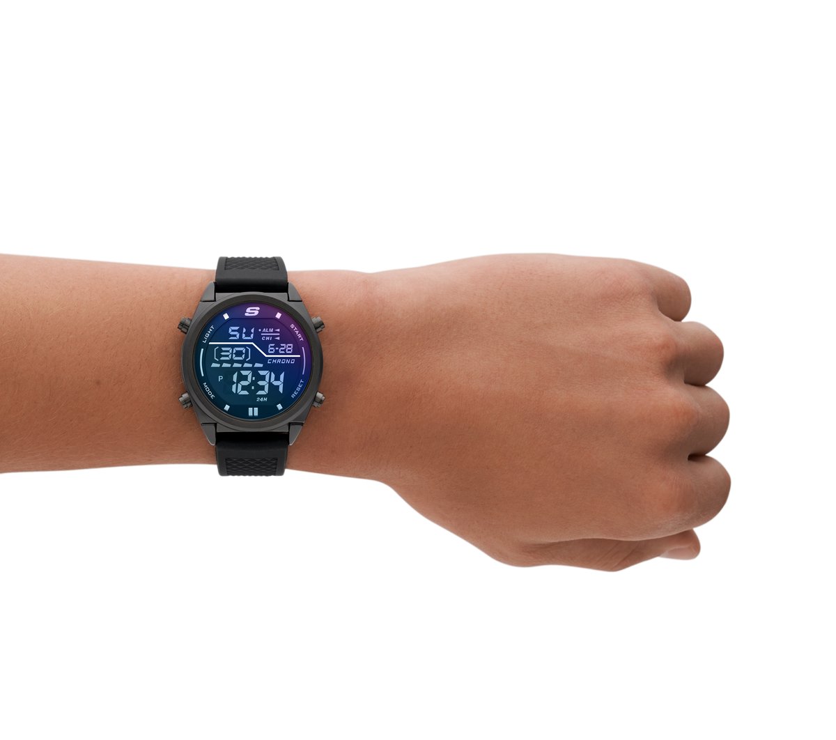 Refined style comes with multiple functions in the Skechers Blue Face Digital Watch. Durable metal and ABS plastic case with silicone sport strap in a refined sporty digital chronograph watch.