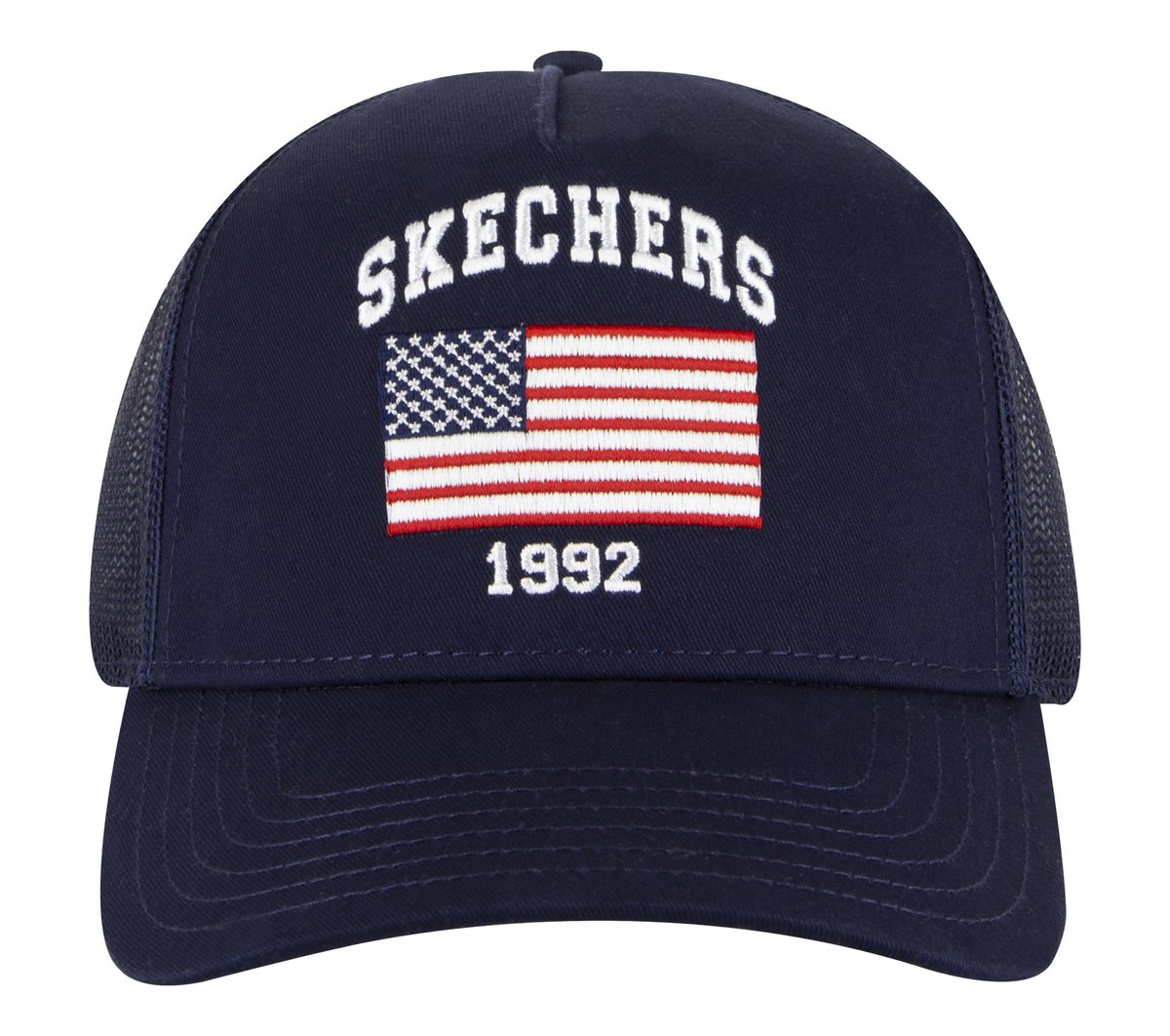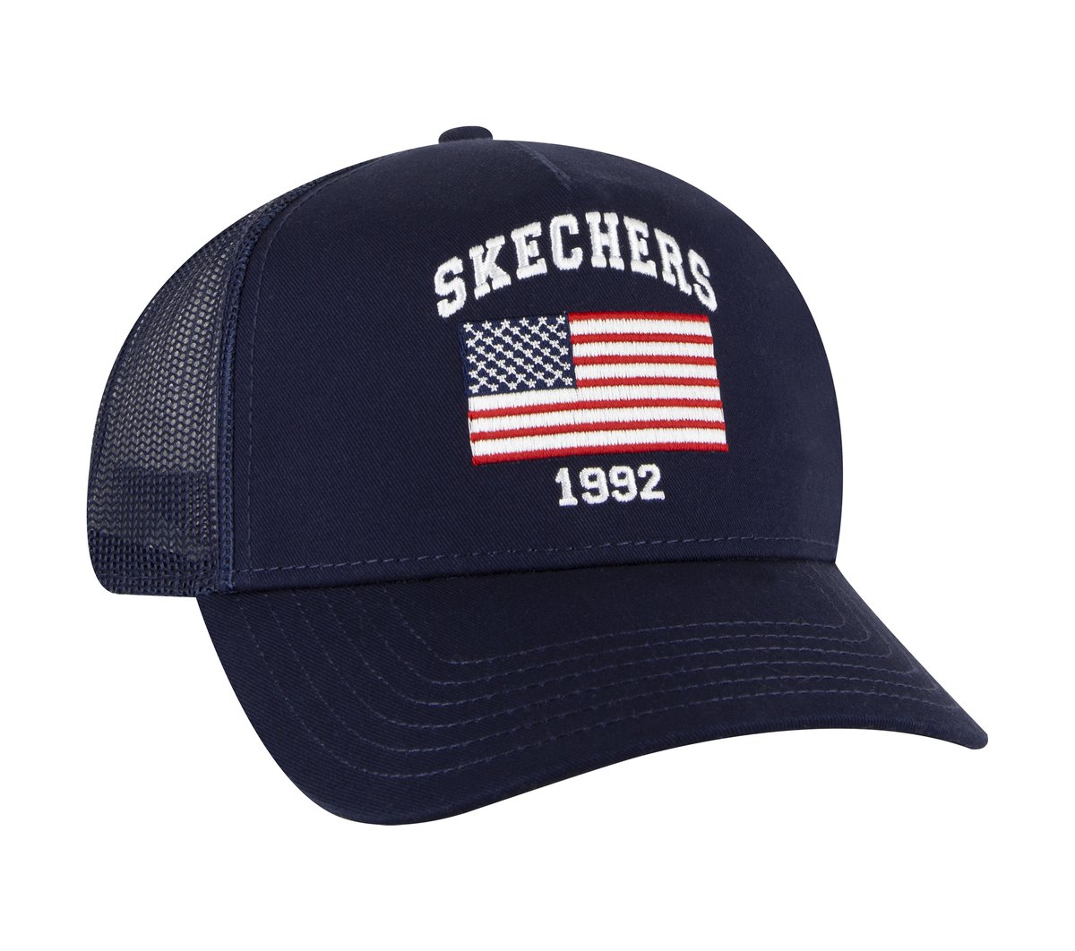 Fly the stars and stripes in comfort with the Skechers USA Flag Trucker Hat. Soft woven fabric and mesh fabric in an adjustable trucker style hat with embroidered American flag and logo design.