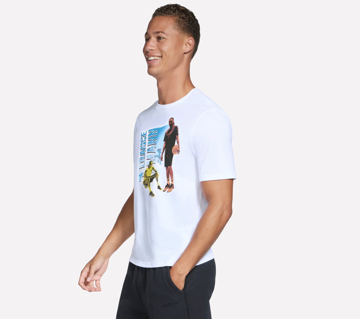 Comfort unlocks peak performance and athletic style with Skechers Basketball®: Terance tee. Made from 100% breathable cotton, this tee features a front graphic celebrating Skechers Pro Athlete Terance Mann.