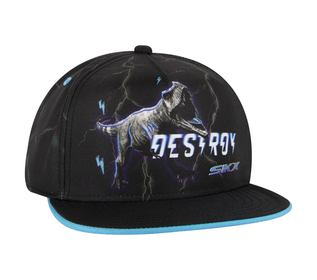 He’ll love the ferocious fun of the Skechers Destroy Dino Hat. Soft fabric in an adjustable kids’ cap design with Tyrannosaurus Rex ‘Destroy’ print and lightning bolt effects.