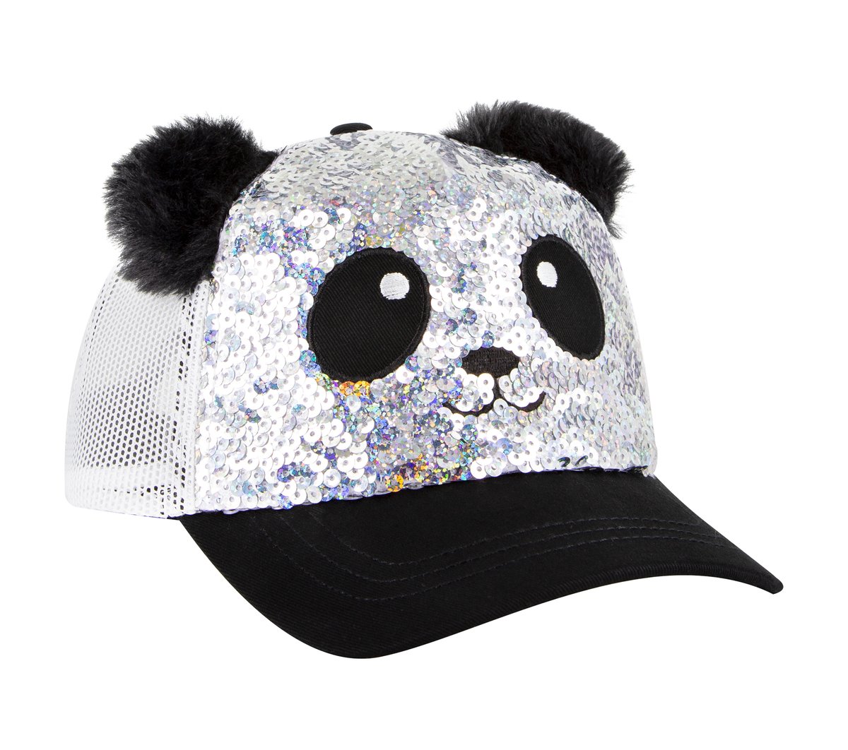 Sparkling and sweet style comes in the Skechers Accessories Sequin Panda Hat. Featuring a soft fabric in an adjustable trucker cap with sequin-design Panda face design at front panel and ear detail.