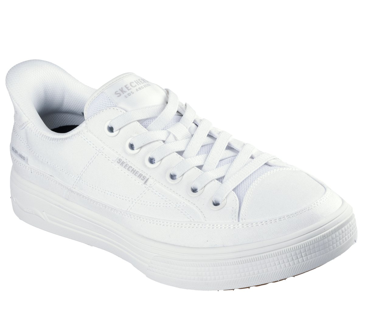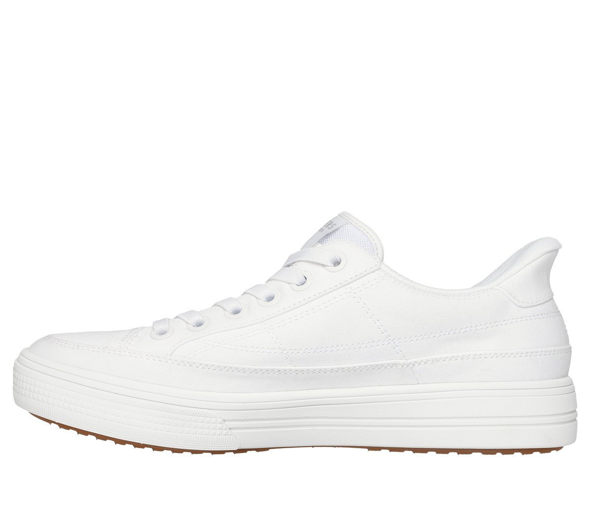 Stroll through the day in amazing cushioned comfort wearing Skechers Hands Free Slip-ins® x Skechers Street™ Arch Fit® Arcade – See Ya There. Designed with our Heel Pillow®, this casual vegan slip-on has been granted the APMA Seal of Acceptance and features a canvas upper with fixed stretch laces, a removable Arch Fit® insole, and a lightweight cushioned midsole.