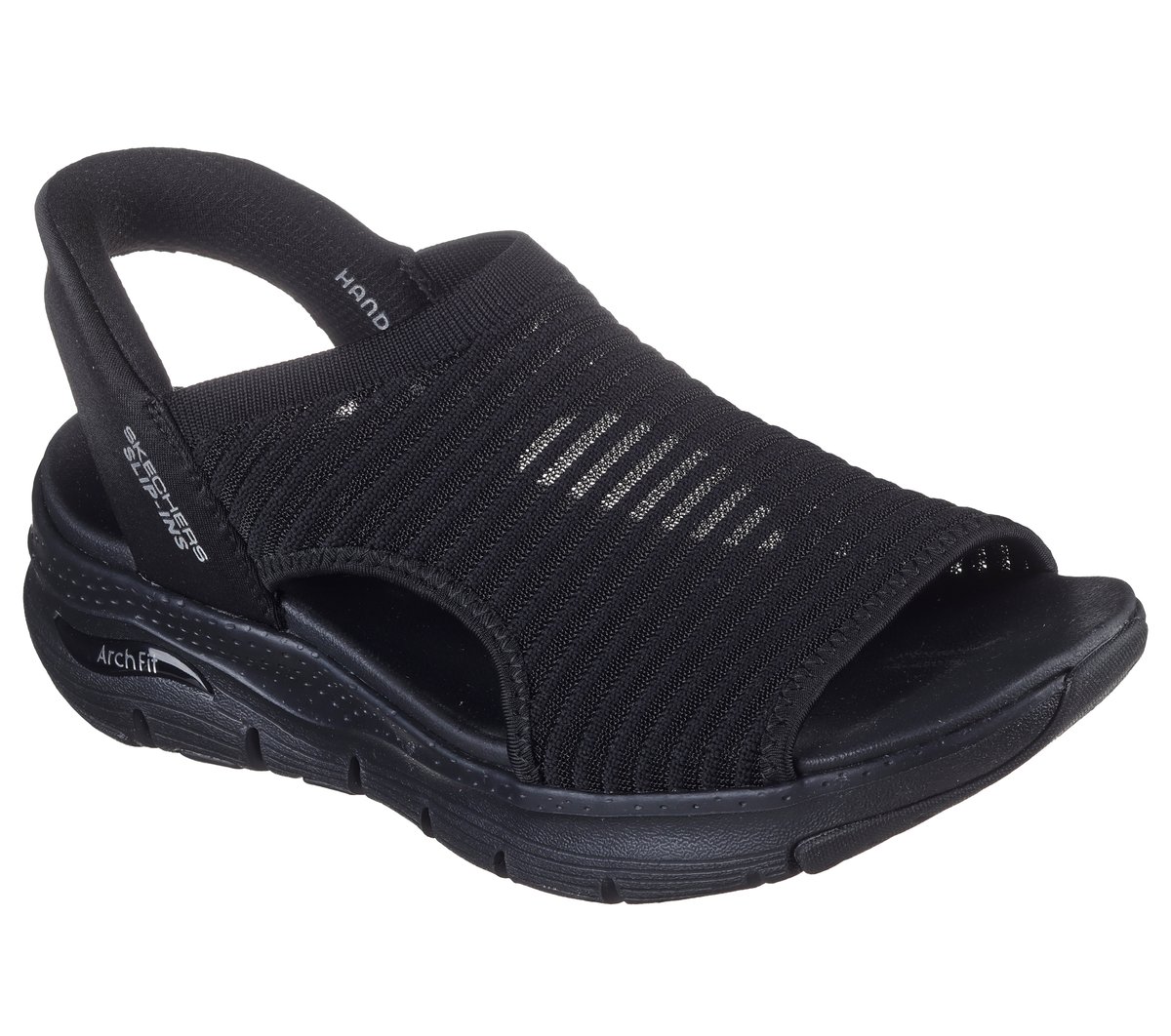 Ease back with style and summery comfort in Skechers Hands Free Slip-ins®: Arch Fit® – Euclid Beach. Designed with our Heel Pillow®, this vegan slingback sandal has been granted the APMA Seal of Acceptance and features a breathable Stretch Fit® monomesh upper with an H-band silhouette, a Skechers Hands Free Slip-ins® back heel, and a supportive Arch Fit® footbed.