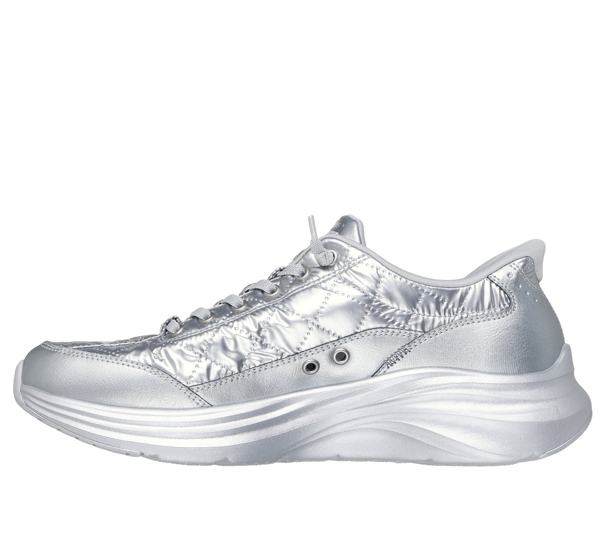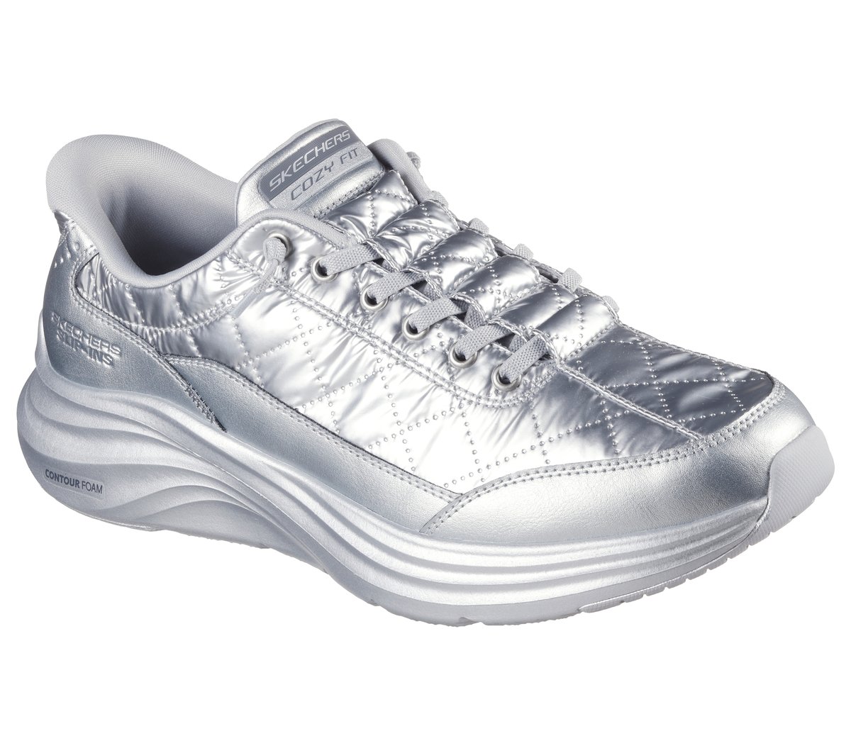 Surround your feet in effortless comfort with Skechers Hands Free Slip-ins®: Contour Foam™ – Cozy Fit®. Designed with our Heel Pillow®, this slip-on style features a quilted Cozy Fit® and synthetic overlay upper with an allover metallic finish, tied-off stretch laces, Contour Foam™ midsole cushioning, and our signature cushioned Skechers Air-Cooled Memory Foam® insole.