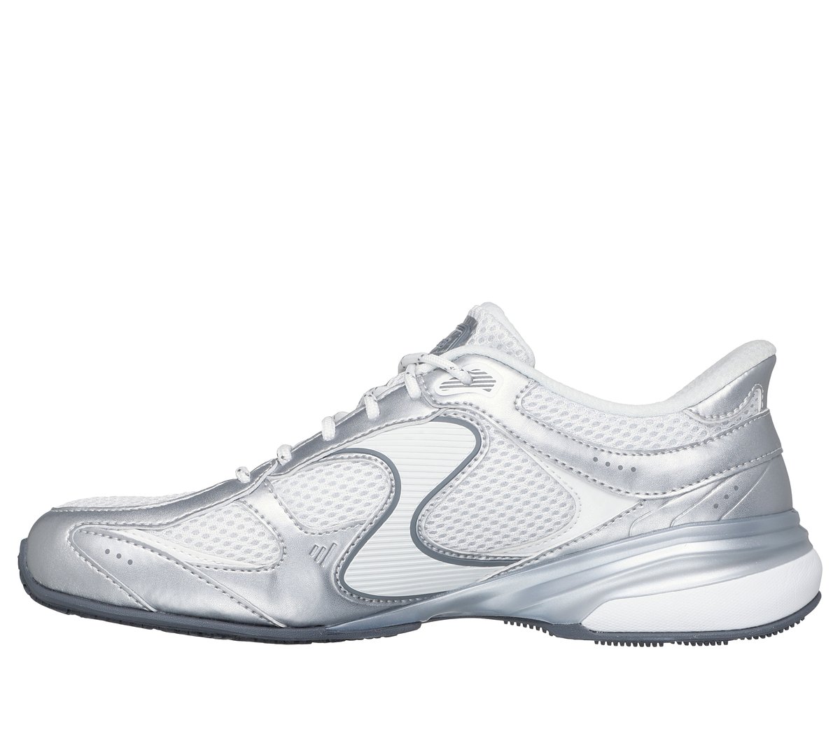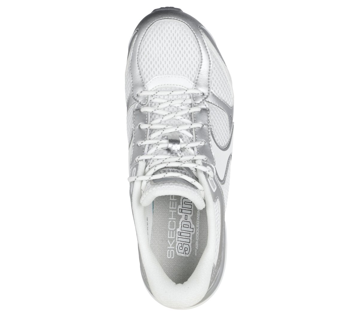 Step into sporty style and effortless comfort with Skechers Hands Free Slip-ins®: Exhilarate – Metallic Dreams. Designed with our Heel Pillow®, this slip-on design features a mesh upper with metallic synthetic overlays, adjustable laces, and a Skechers Air-Cooled Memory Foam® insole.