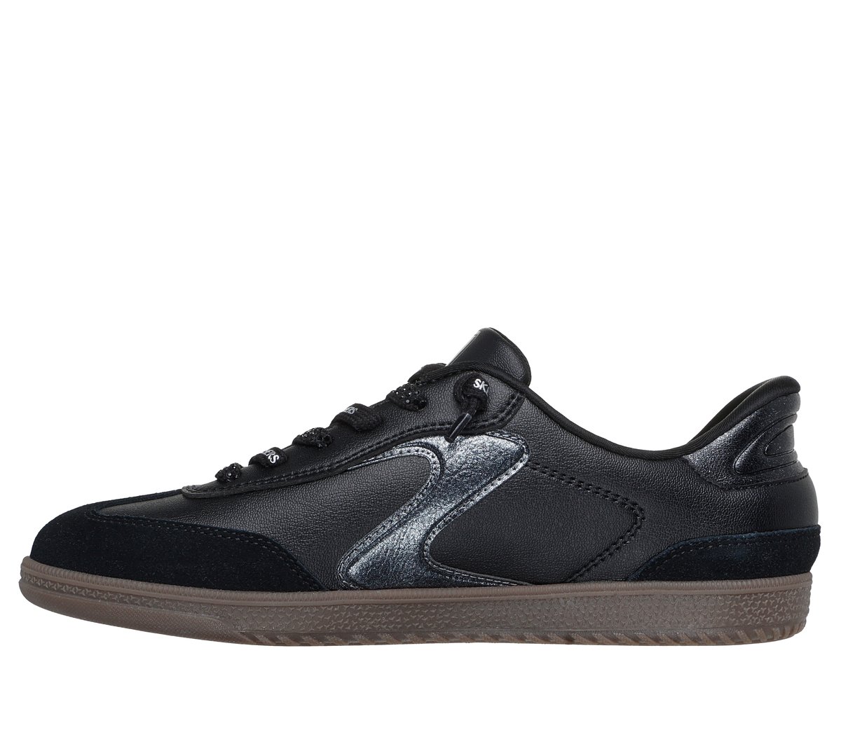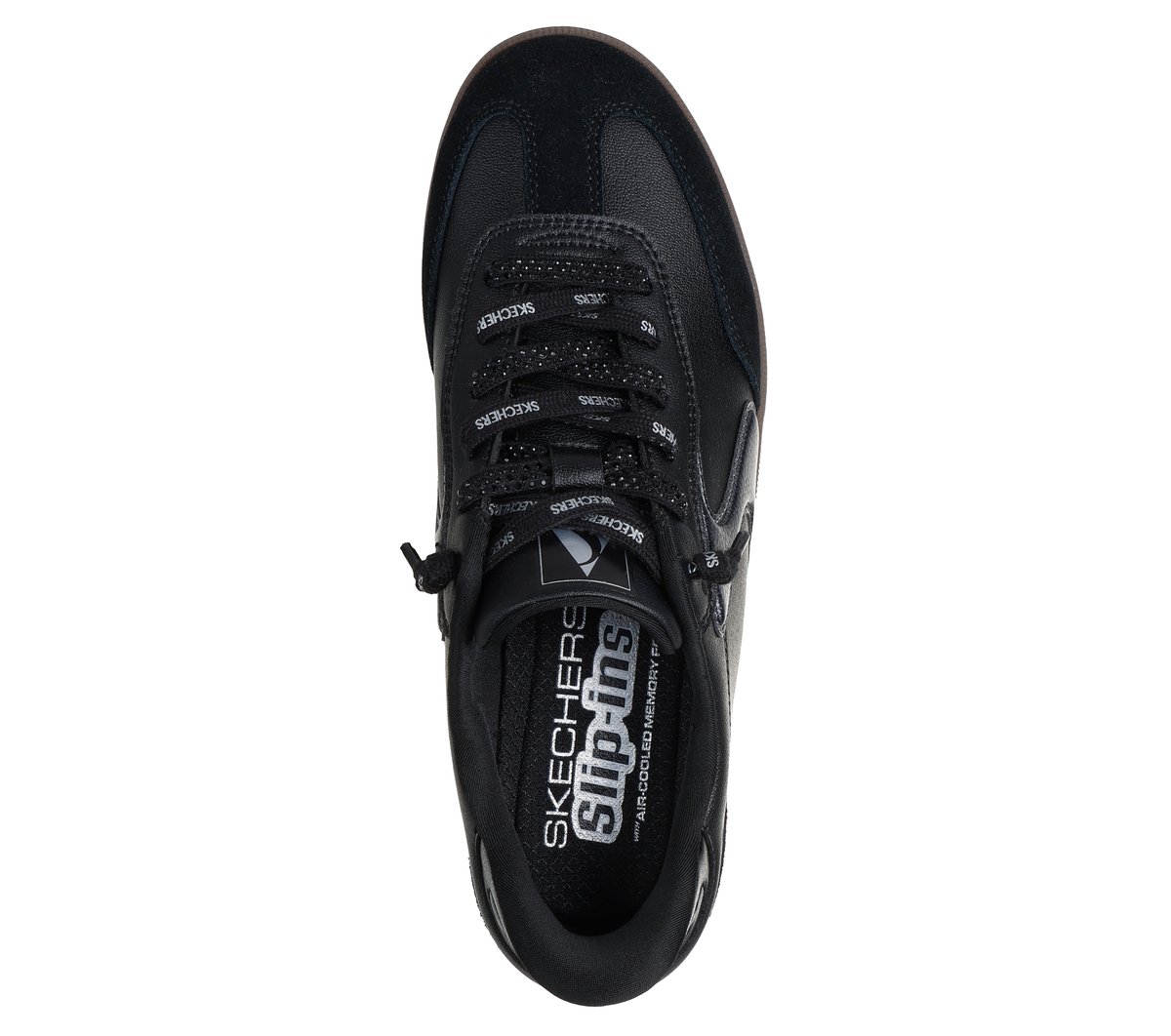 A modern classic meets easy-wearing comfort in Skechers Hands Free Slip-ins®: Hotshot – Shimmer and Shine. Designed with our Heel Pillow®, this Court & Classics slip-on features a synthetic duraleather and suede overlay upper with rhinestone-embellished deco laces, contrast ‘S’ quarter logo detail, and our signature Skechers Air-Cooled Memory Foam® cushioned insole.
